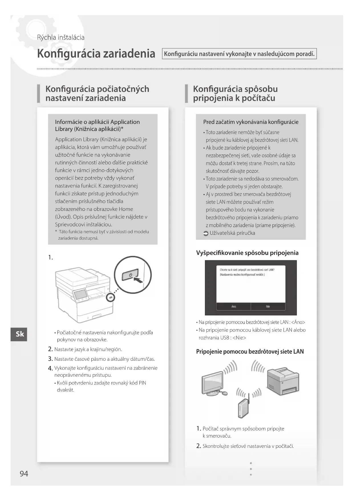- Počiatočné nastavenia nakonfigurujte podľa pokynov na obrazovke. Nastavte jazyk akrajinu/región. Nastavte časové pásmo aaktuálny dátum/čas. Vykonajte konfiguráciu nastavení na zabránenie neoprávnenému prístupu.• Kvôli potvrdeniu zadajte rovnaký kód PIN dvakrát.Pred začatím vykonávania konfigurácie Toto zariadenie nemôže byť súčasne pripojené ku káblovej aj bezdrôtovej sieti LAN. Ak bude zariadenie pripojené k nezabezpečenej sieti, vaše osobné údaje sa môžu dostať k tretej strane. Prosím, na túto skutočnosť dávajte pozor. Toto zariadenie sa nedodáva so smerovačom. V prípade potreby si jeden obstarajte. Aj v prostredí bez smerovača bezdrôtovej siete LAN môžete používať režim prístupového bodu na vykonanie bezdrôtového pripojenia k zariadeniu priamo z mobilného zariadenia (priame pripojenie). Užívateľská príručkaVyšpecikovanie spôsobu pripojenia Na pripojenie pomocou bezdrôtovej siete LAN : <Áno>• Na pripojenie pomocou káblovej siete LAN alebo rozhrania USB : <Nie>Pripojenie pomocou bezdrôtovej siete LAN Počítač správnym spôsobom pripojte ksmerovaču. Skontrolujte sieťové nastavenia vpočítači.