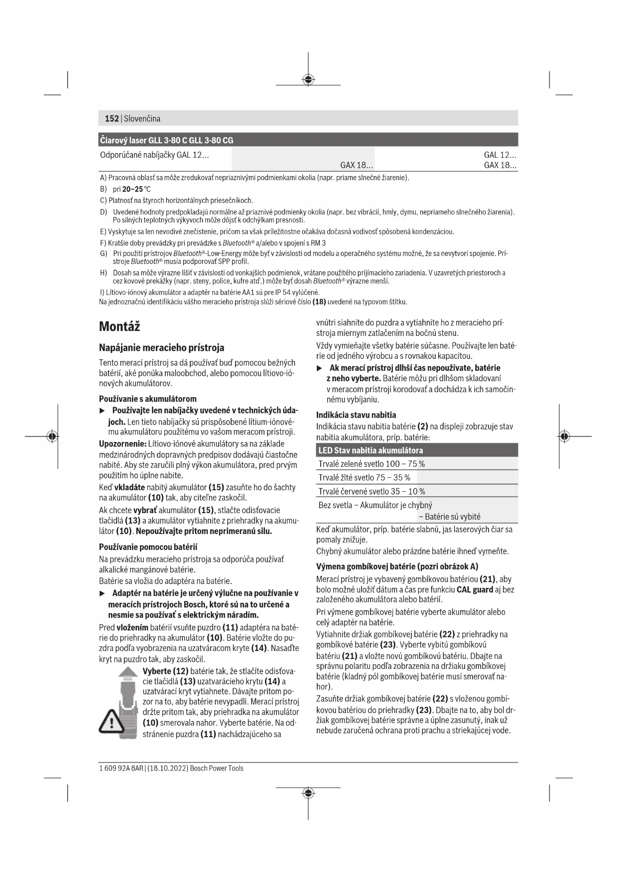 IP54 (chránené proti prachu astriekajú- cej vode) IP54 (chránené proti prachu astriekajú- cej vode) Odporúčaná teplota prostredia pri na- bíjaní 0°C…+35°C 0°C…+35°C Povolená teplota okolia pri prevádzke −10°C…+40°C −10°C…+40°C Povolená teplota okolia pri skladovaní −20°C…+70°C −20°C…+70°C Odporúčané akumulátory GBA 12V… (okrem GBA12V ≥4,0Ah) GBA 12V… (okrem GBA12V ≥4,0Ah) Bosch Power Tools 1 609 92A 8AR | (18.10.2022)152 | Slovenčina Čiarový laser GLL 3-80 C GLL 3-80 CG Odporúčané nabíjačky GAL 12… GAX 18… GAL 12… GAX 18… A) Pracovná oblasť sa môže zredukovať nepriaznivými podmienkami okolia (napr. priame slnečné žiarenie).
