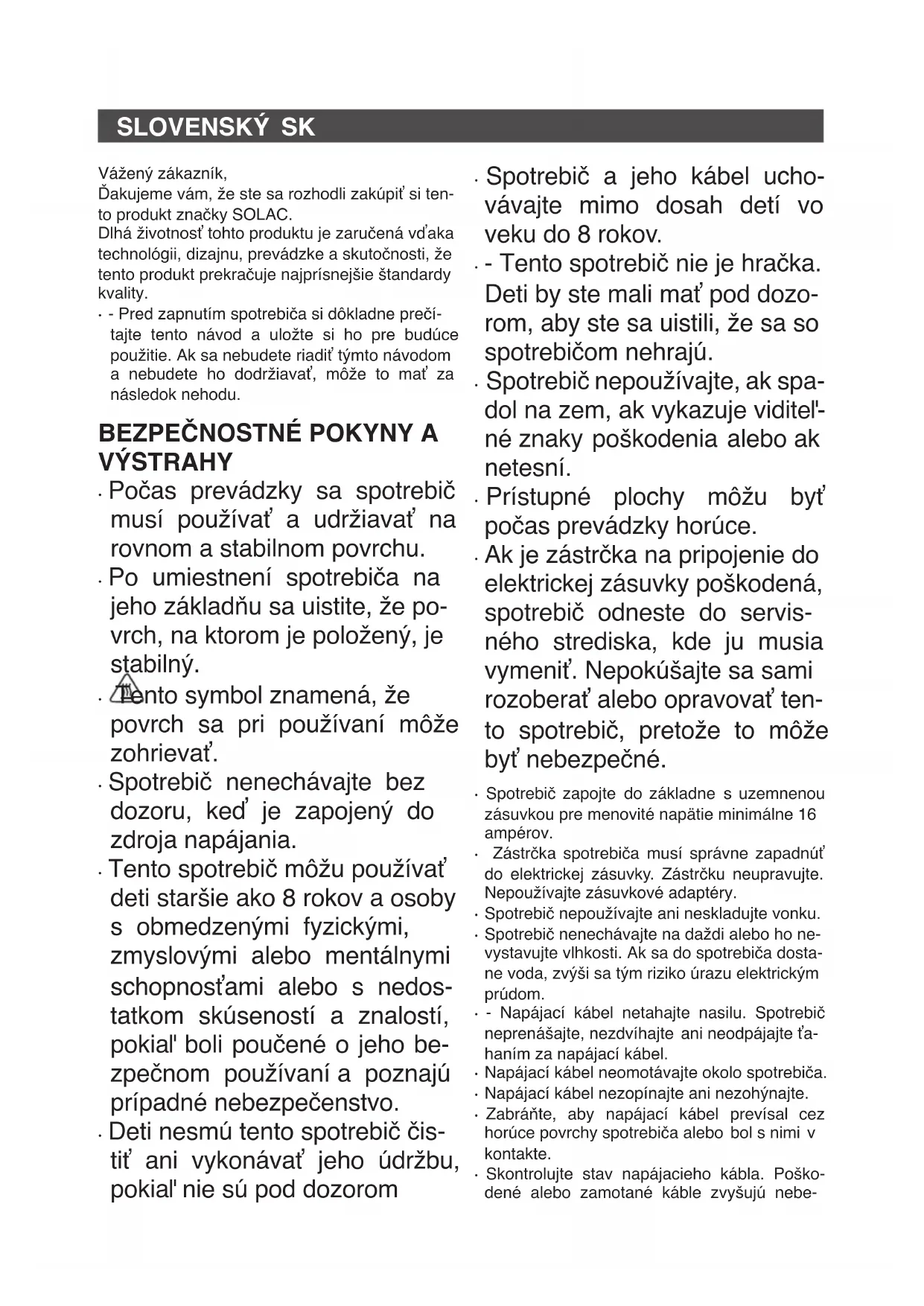 - - Pred zapnutím spotrebiča si dôkladne prečí- tajte tento návod a uložte si ho pre budúce použitie. Ak sa nebudete riadiť týmto návodom a nebudete ho dodržiavať, môže to mať za následok nehodu.