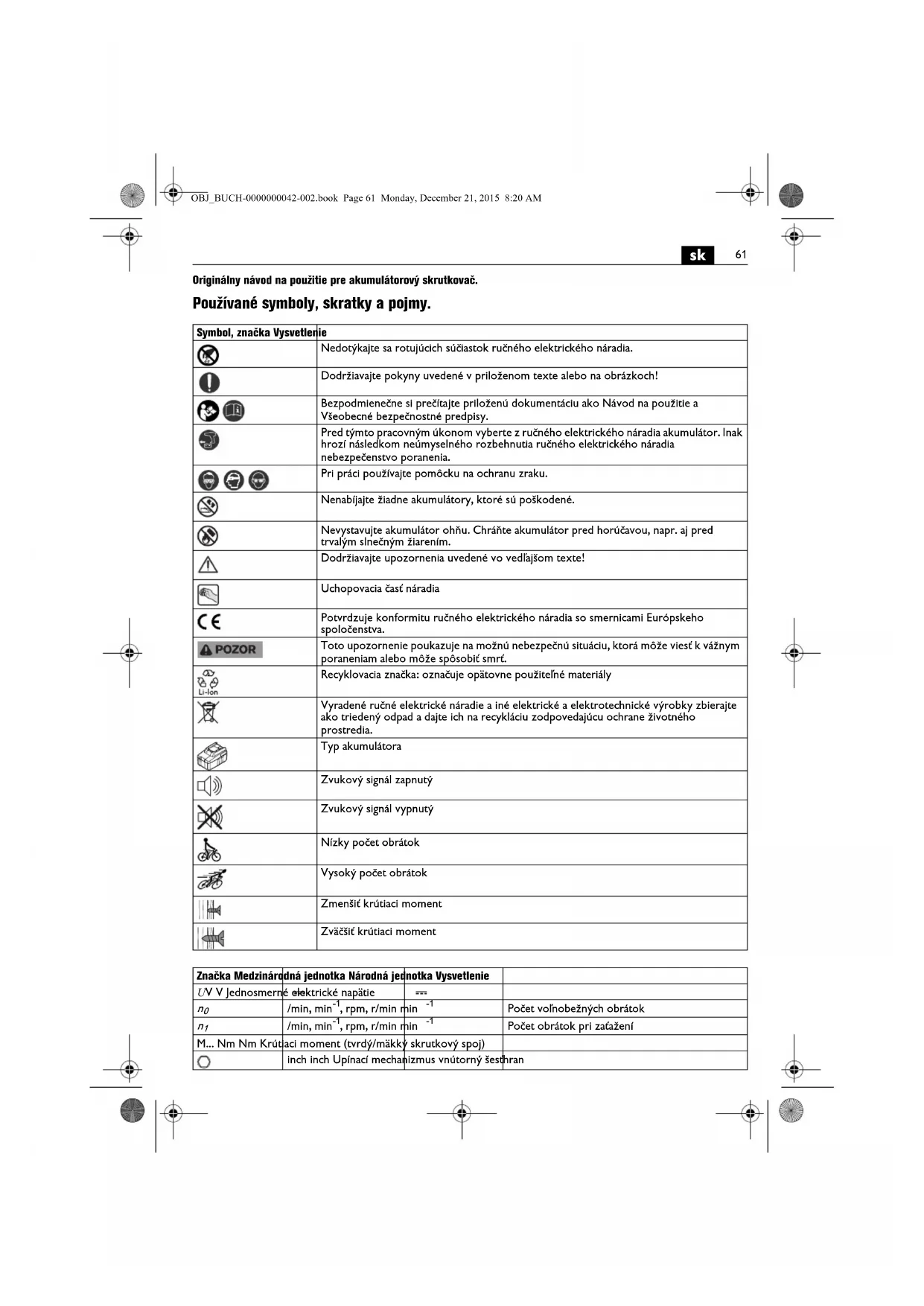 Originálny návod na použitie pre akumulátorový skrutkovač. Používané symboly, skratky a pojmy. Symbol, značka Vysvetlenie Nedotýkajte sa rotujúcich súčiastok ručného elektrického náradia. Dodržiavajte pokyny uvedené v priloženom texte alebo na obrázkoch! Bezpodmienečne si prečítajte priloženú dokumentáciu ako Návod na použitie a Všeobecné bezpečnostné predpisy. Pred týmto pracovným úkonom vyberte z ručného elektrického náradia akumulátor. Inak hrozí následkom neúmyselného rozbehnutia ručného elektrického náradia nebezpečenstvo poranenia. Pri práci používajte pomôcku na ochranu zraku. Nenabíjajte žiadne akumulátory, ktoré sú poškodené. Nevystavujte akumulátor ohňu. Chráňte akumulátor pred horúčavou, napr. aj pred trvalým slnečným žiarením. Dodržiavajte upozornenia uvedené vo vedľajšom texte! Uchopovacia časť náradia Potvrdzuje konformitu ručného elektrického náradia so smernicami Európskeho spoločenstva. Toto upozornenie poukazuje na možnú nebezpečnú situáciu, ktorá môže viesť k vážnym poraneniam alebo môže spôsobiť smrť. Recyklovacia značka: označuje opätovne použiteľné materiály Vyradené ručné elektrické náradie a iné elektrické a elektrotechnické výrobky zbierajte ako triedený odpad a dajte ich na recykláciu zodpovedajúcu ochrane životného prostredia. Typ akumulátora Zvukový signál zapnutý Zvukový signál vypnutý Nízky počet obrátok Vysoký počet obrátok Zmenšiť krútiaci moment Zväčšiť krútiaci moment Značka Medzinárodná jednotka Národná jednotka Vysvetlenie U V V Jednosmerné elektrické napätie