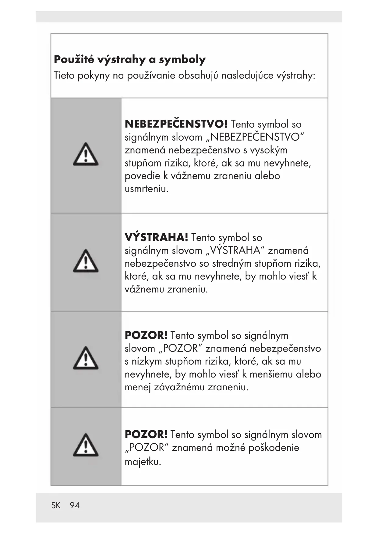 - Ak sa súčasne použijú všetky výstupy, celkový výstupný prúd nesmie prekročiť 3 A.SK 99 Bezpečnostné upozornenia Pred prvým použitím výrobku sa oboznámte s celým návodom na používanie a všetkými bezpečnostnými upozorneniami. Pri odovzdávaní tohto výrobku tretej strane nezabudnite zahrnúť celú dokumentáciu. Pred použitím skontrolujte, či nie je výrobok viditeľne navonok poškodený. Nepoužívajte výrobok, ak došlo k jeho poškodeniu alebo pádu. Tento výrobok smú používať deti vo veku od 8 rokov, ako aj osoby so zhoršenými fyzickými, zmyslovými alebo duševnými schopnosťami alebo nedostatkom skúseností a/alebo znalostí, pokiaľ je pre ne zabezpečený dozor alebo zaškolenie ohľadom používania výrobku bezpečným spôsobom a pokiaľ rozumejú rizikám spojeným s jeho používaním. Je potrebné dohliadnuť na to, aby sa deti s týmto výrobkom nehrali. Nikdy nedovoľte, aby čistenie a používateľskú údržbu vykonávali deti bez dozoru.