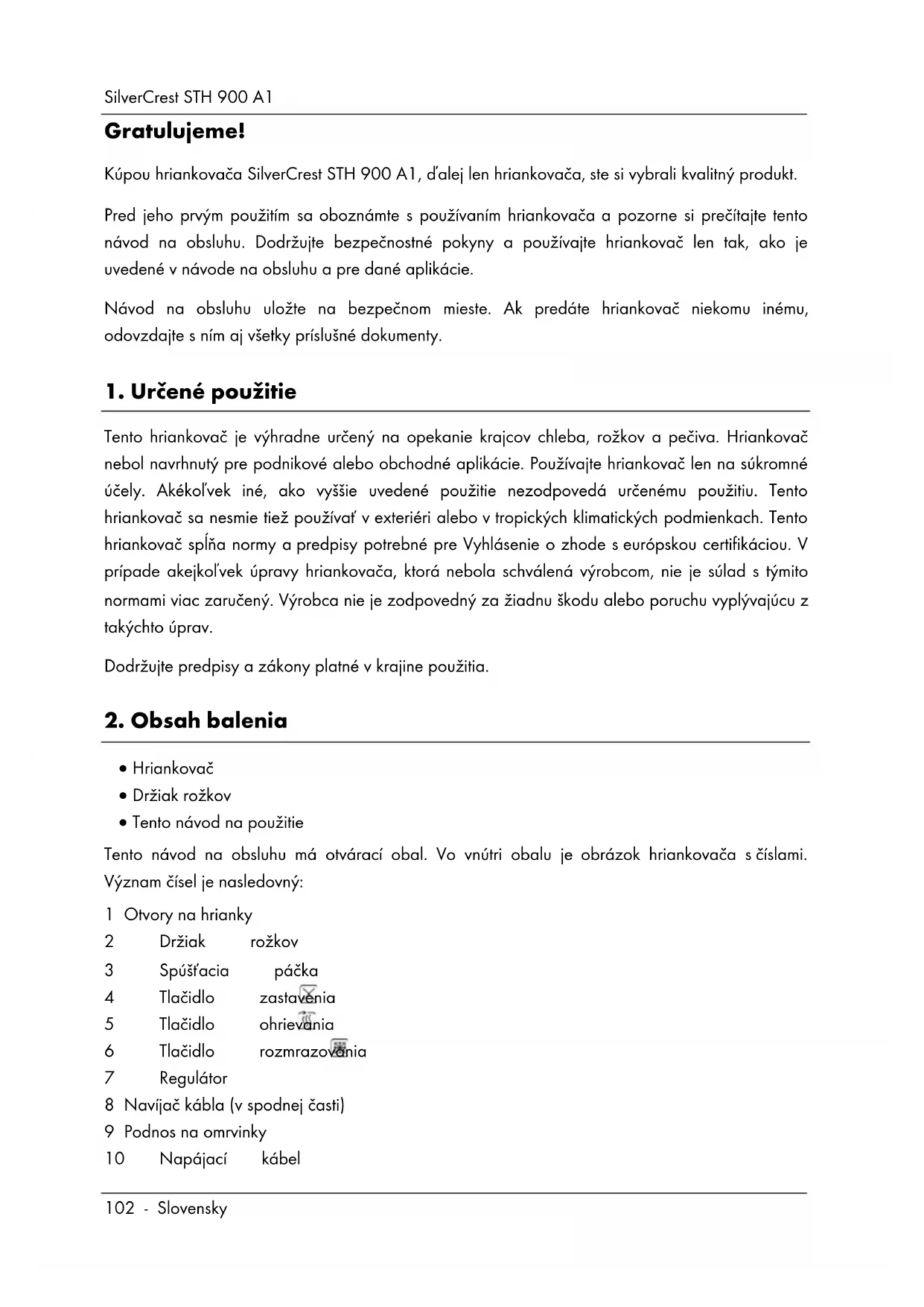 Gratulujeme! Kúpou hriankovača SilverCrest STH 900 A1, ďalej len hriankovača, ste si vybrali kvalitný produkt. Pred jeho prvým použitím sa oboznámte s používaním hriankovača a pozorne si prečítajte tento návod na obsluhu. Dodržujte bezpečnostné pokyny a používajte hriankovač len tak, ako je uvedené v návode na obsluhu a pre dané aplikácie. Návod na obsluhu uložte na bezpečnom mieste. Ak predáte hriankovač niekomu inému, odovzdajte s ním aj všetky príslušné dokumenty.