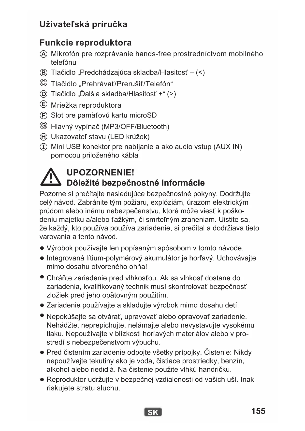 Mini USB konektor pre nabíjanie a ako audio vstup (AUX IN) pomocou priloženého kábla UPOZORNENIE! Dôležité bezpečnostné informácie Pozorne si prečítajte nasledujúce bezpečnostné pokyny. Dodržujte celý návod. Zabránite tým požiaru, explóziám, úrazom elektrickým prúdom alebo inému nebezpečenstvu, ktoré môže viesť k poško- deniu majetku a/alebo ťažkým, či smrteľným zraneniam. Uistite sa, že každý, kto používa používa zariadenie, si prečítal a dodržiava tieto varovania a tento návod.