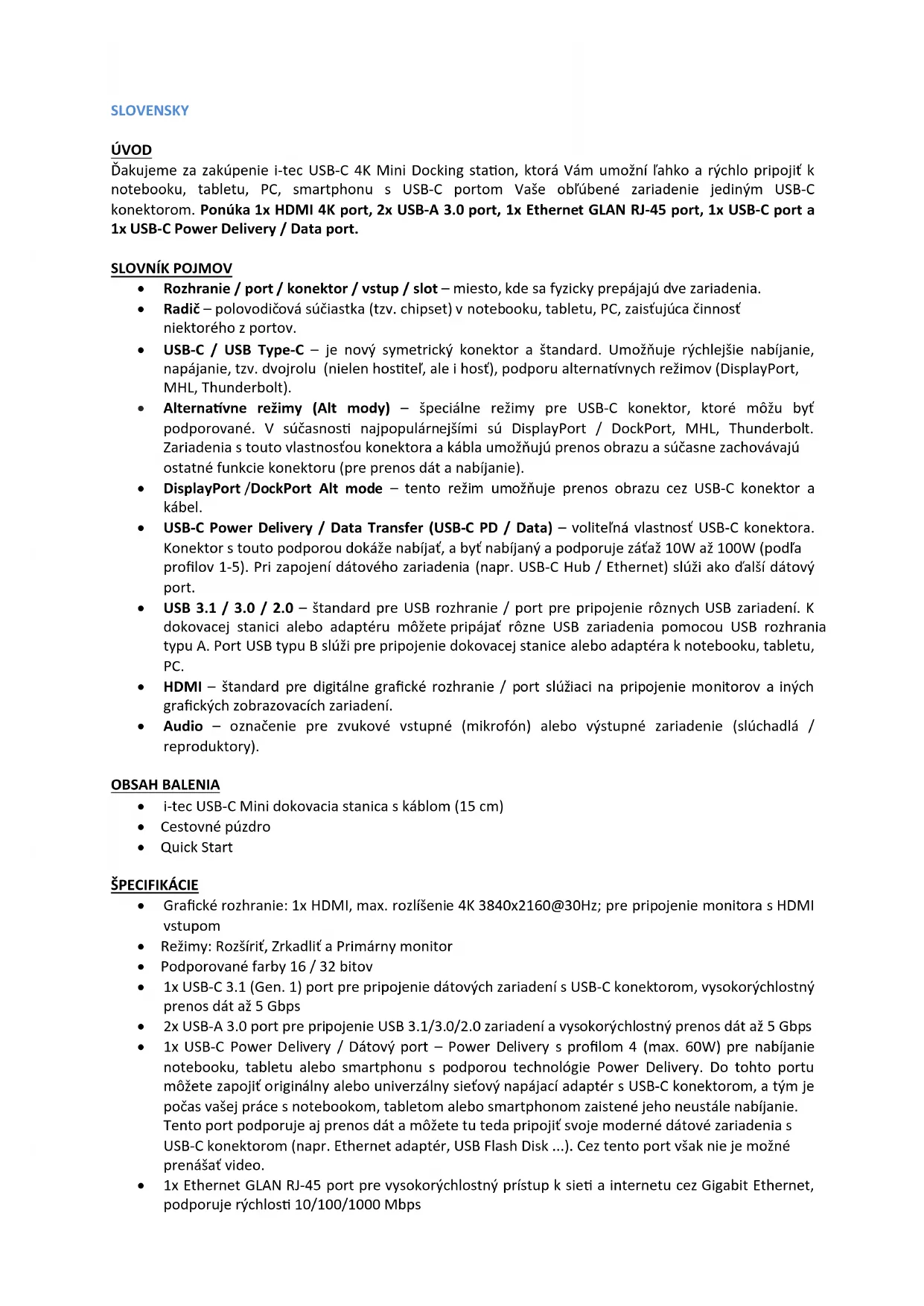 Otázka: Aké sú požiadavky na primárne grafické karty pre použitie s grafickými chipsetmi v i-tec grafických adaptéroch a dokovacích staniciach?Odpoveď: Grafické chipsety sú sekundárne (ďalšie) grafické karty v PC. Pre svoju činnosť potrebujú mať nainštalovanú primárnu grafickou kartu. Windows 10 a neskorší: V týchto operačných systémoch grafický ovládač pracuje len v závislosti na primárnych grafických kartách: Intel, NVidia, ATI/AMD, VIA. Nedokáže pracovať s SiS alebo Matrox grafickými kartami. Otázka: Môžem získať podrobnejšie informácie o problémoch s USB-C dokovacej stanice? Odpoveď: Iste, môžete sa obrátiť na našu technickú podporu: support@itecproduct.com Otázka: Zariadenie nenabíja Apple / Samsung tablet. Odpoveď: V prípade, že sa zariadenie nenabíja alebo nepracuje, potom pripojte originálny / externý USB-C napájací adaptér do napájacieho konektora materského notebooku / Macu / smartphonu / tabletu alebo USB-C portu dokovacej stanice pre podporu napájania. Bohužiaľ i napriek európskej norme o zlúčení napájacích zariadení chránia niektoré firmy svoje značkové výrobky tak, že sa dajú nabíjať len originálnym / licencovaným napájacím adaptérom prostredníctvom USB-C portu.LIETUVOS ĮVADAS Dėkojame, kad įsigijote i-tec USB-C 4K Mini Docking Station, kuri Jums padės lengvai ir greitai per vieną USB-C jungtį prijungti Jūsų mėgstamus įrenginius prie nešiojamo kompiuterio, planšetės, PC, išmaniojo telefono su USB-C prievadu. Turi 1x HDMI prievadą, 2x USB-A 3.0 prievadą, 1x Ethernet GLAN RJ-45 prievadą, 1x USB-C prievadą ir 1x USB-C Power Delivery / Data prievadą.