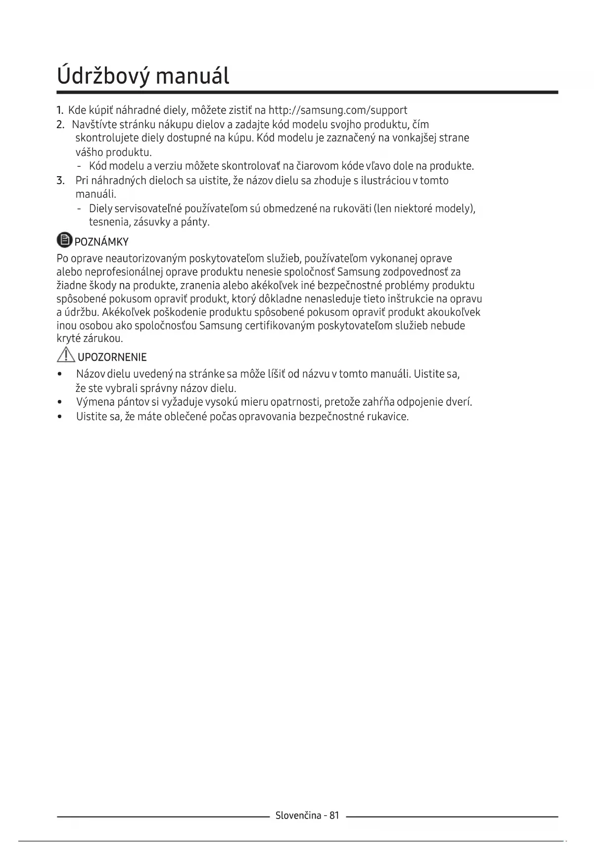 manuáli. ‐ Diely servisovateľné používateľom sú obmedzené na rukoväti (len niektoré modely), tesnenia, zásuvky a pánty. POZNÁMKY Po oprave neautorizovaným poskytovateľom služieb, používateľom vykonanej oprave alebo neprofesionálnej oprave produktu nenesie spoločnosť Samsung zodpovednosť za žiadne škody na produkte, zranenia alebo akékoľvek iné bezpečnostné problémy produktu spôsobené pokusom opraviť produkt, ktorý dôkladne nenasleduje tieto inštrukcie na opravu a údržbu. Akékoľvek poškodenie produktu spôsobené pokusom opraviť produkt akoukoľvek inou osobou ako spoločnosťou Samsung certifikovaným poskytovateľom služieb nebude kryté zárukou. UPOZORNENIE