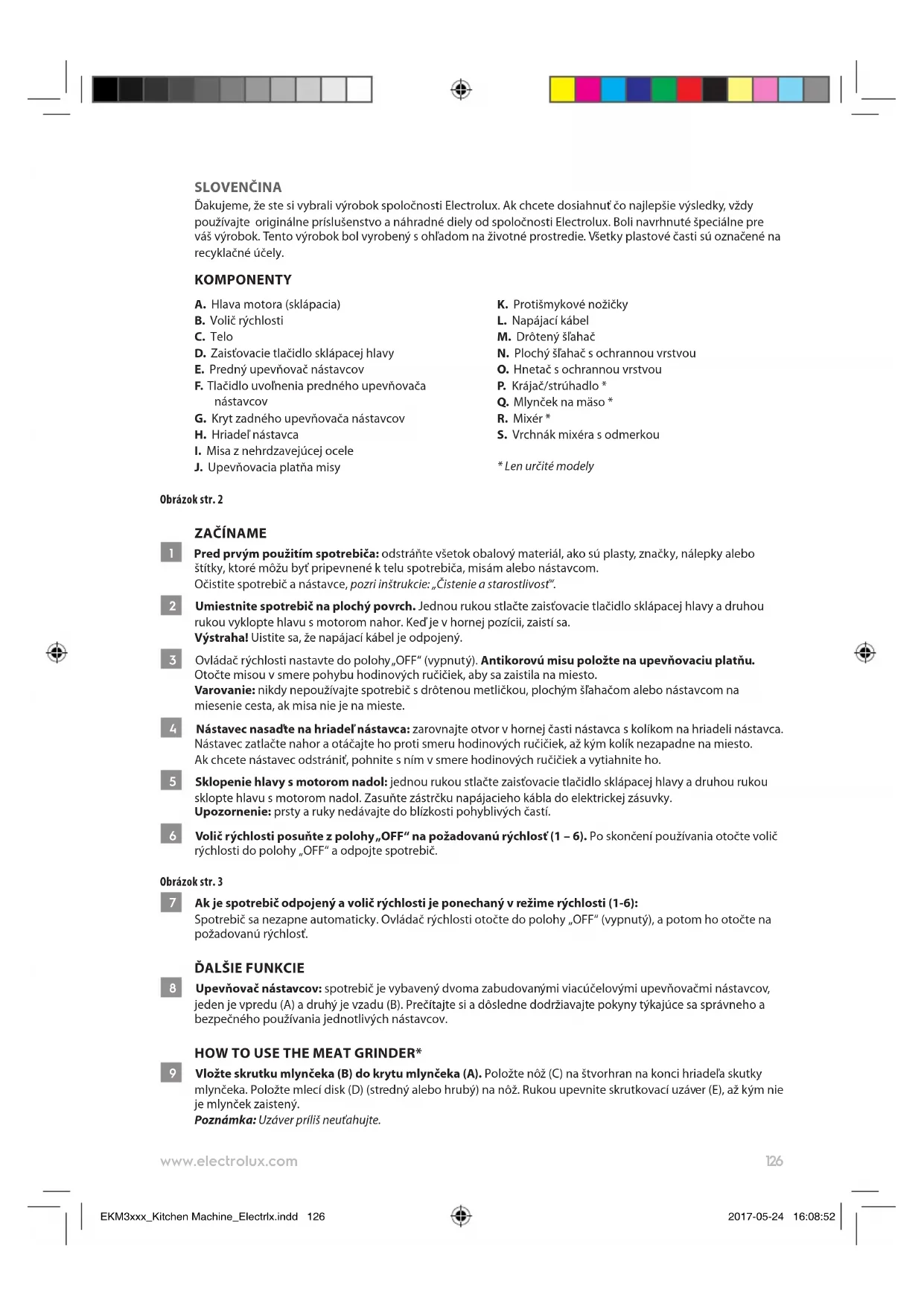 - Tento prístroj je určený len na používanie vdomácnosti. Ak sa prístroj používa na iné ako stanovené účely alebo sa používa nesprávne, vprípade poškodenia neposkytuje EKM3xxx_Kitchen Machine_Electrlx.indd 128 2017-05-24 16:08:53129 www.electrolux.com