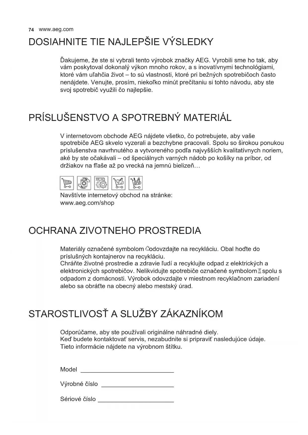 Ďakujeme, že ste si vybrali tento výrobok značky AEG. Vyrobili sme ho tak, aby vám poskytoval dokonalý výkon mnoho rokov, a s inovatívnymi technológiami, ktoré vám uľahčia život – to sú vlastnosti, ktoré pri bežných spotrebičoch často nenájdete. Venujte, prosím, niekoľko minút prečítaniu si tohto návodu, aby ste svoj spotrebič využili čo najlepšie. PRÍSLUŠENSTVO A SPOTREBNÝ MATERIÁL V internetovom obchode AEG nájdete všetko, čo potrebujete, aby vaše spotrebiče AEG skvelo vyzerali a bezchybne pracovali. Spolu so širokou ponukou príslušenstva navrhnutého a vytvoreného podľa najvyšších kvalitatívnych noriem, aké by ste očakávali – od špeciálnych varných nádob po košíky na príbor, od držiakov na fľaše až po vrecká na jemnú bielizeň… Navštívte internetový obchod na stránke: www.aeg.com/shop