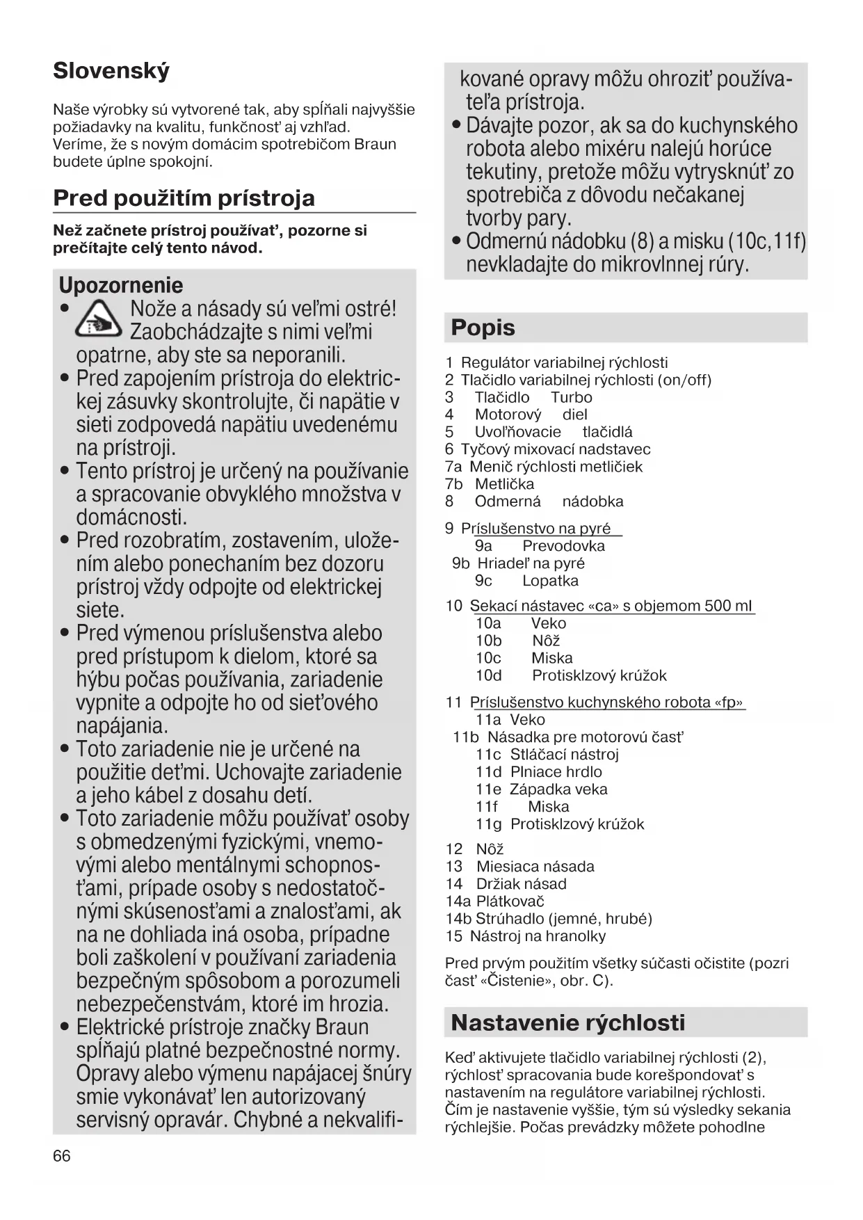 Elektrické prístroje značky Braun spĺňajú platné bezpečnostné normy. Opravy alebo výmenu napájacej šnúry smie vykonávať len autorizovaný servisný opravár. Chybné a nekvalifi- kované opravy môžu ohroziť používa- teľa prístroja.