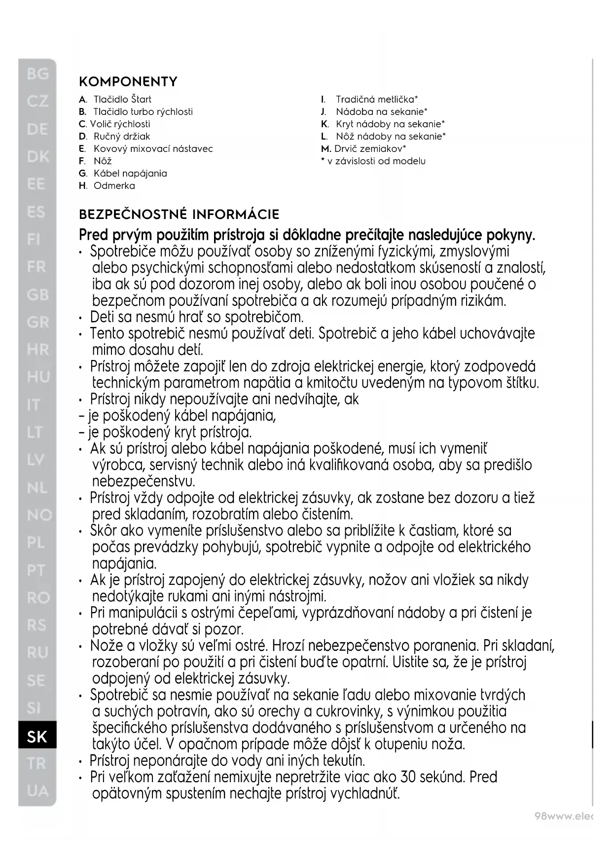 KOMPONENTY A. Tlačidlo Štart B. Tlačidlo turbo rýchlosti C. Volič rýchlosti D. Ručný držiak E. Kovový mixovací nástavec F. Nôž G. Kábel napájania H. Odmerka