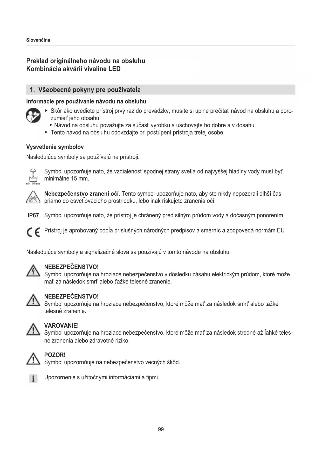 zumieť jeho obsahu. ▶ Návod na obsluhu považujte za súčasť výrobku a uschovajte ho dobre a v dosahu. ▶ Tento návod na obsluhu odovzdajte pri postúpení prístroja tretej osobe. Vysvetlenie symbolov Nasledujúce symboly sa používajú na prístroji. Symbol upozorňuje nato, že vzdialenosť spodnej strany svetla od najvyššej hladiny vody musí byť minimálne 15 mm. Nebezpečenstvo zranení očí. Tento symbol upozorňuje nato, aby ste nikdy nepozerali dlhší čas priamo do osvetľovacieho prostriedku, lebo inak riskujete zranenia očí. Symbol upozorňuje nato, že prístroj je chránený pred silným prúdom vody a dočasným ponorením. Prístroj je aprobovaný podľa príslušných národných predpisov a smerníc a zodpovedá normám EU Nasledujúce symboly a signalizačné slová sa používajú v tomto návode na obsluhu. NEBEZPEČENSTVO! Symbol upozorňuje na hroziace nebezpečenstvo v dôsledku zásahu elektrickým prúdom, ktoré môže mať za následok smrť alebo ťažké telesné zranenie. NEBEZPEČENSTVO! Symbol upozorňuje na hroziace nebezpečenstvo, ktoré môže mať za následok smrť alebo tažké telesné zranenie. VAROVANIE! Symbol upozorňuje na hroziace nebezpečenstvo, ktoré môže mať za následok stredné až ľahké teles