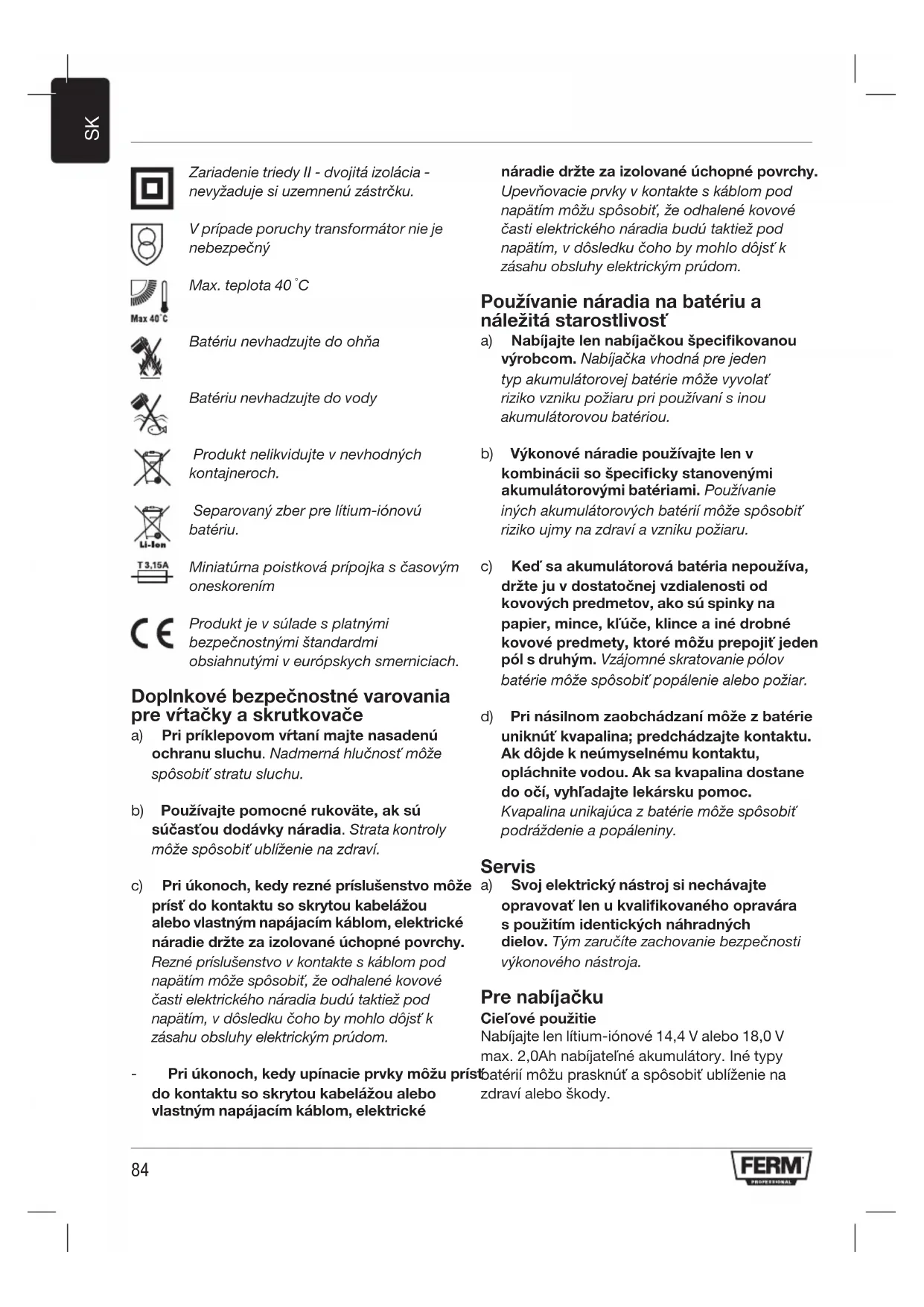 Batériu nevhadzujte do ohňa Batériu nevhadzujte do vody Produkt nelikvidujte v nevhodných kontajneroch. Separovaný zber pre lítium-iónovú batériu. Miniatúrna poistková prípojka s časovým oneskorením Produkt je v súlade s platnými bezpečnostnými štandardmi obsiahnutými v európskych smerniciach. Doplnkové bezpečnostné varovania pre vŕtačky a skrutkovače a) Pri príklepovom vŕtaní majte nasadenú ochranu sluchu. Nadmerná hlučnosť môže spôsobiť stratu sluchu. b) Používajte pomocné rukoväte, ak sú súčasťou dodávky náradia. Strata kontroly môže spôsobiť ublíženie na zdraví. c) Pri úkonoch, kedy rezné príslušenstvo môže prísť do kontaktu so skrytou kabelážou alebo vlastným napájacím káblom, elektrické náradie držte za izolované úchopné povrchy. Rezné príslušenstvo v kontakte s káblom pod napätím môže spôsobiť, že odhalené kovové časti elektrického náradia budú taktiež pod napätím, v dôsledku čoho by mohlo dôjsť k zásahu obsluhy elektrickým prúdom. - Pri úkonoch, kedy upínacie prvky môžu prísť do kontaktu so skrytou kabelážou alebo vlastným napájacím káblom, elektrické náradie držte za izolované úchopné povrchy. Upevňovacie prvky v kontakte s káblom pod napätím môžu spôsobiť, že odhalené kovové časti elektrického náradia budú taktiež pod napätím, v dôsledku čoho by mohlo dôjsť k zásahu obsluhy elektrickým prúdom. Používanie náradia na batériu a náležitá starostlivosť a) Nabíjajte len nabíjačkou špecikovanou výrobcom. Nabíjačka vhodná pre jeden typ akumulátorovej batérie môže vyvolať riziko vzniku požiaru pri používaní s inou akumulátorovou batériou. b) Výkonové náradie používajte len v kombinácii so špecicky stanovenými akumulátorovými batériami. Používanie iných akumulátorových batérií môže spôsobiť riziko ujmy na zdraví a vzniku požiaru. c) Keď sa akumulátorová batéria nepoužíva, držte ju v dostatočnej vzdialenosti od kovových predmetov, ako sú spinky na papier, mince, kľúče, klince a iné drobné kovové predmety, ktoré môžu prepojiť jeden pól s druhým. Vzájomné skratovanie pólov batérie môže spôsobiť popálenie alebo požiar. d) Pri násilnom zaobchádzaní môže z batérie uniknúť kvapalina; predchádzajte kontaktu. Ak dôjde k neúmyselnému kontaktu, opláchnite vodou. Ak sa kvapalina dostane do očí, vyhľadajte lekársku pomoc. Kvapalina unikajúca z batérie môže spôsobiť podráždenie a popáleniny. Servis a) Svoj elektrický nástroj si nechávajte opravovať len u kvalikovaného opravára s použitím identických náhradných dielov. Tým zaručíte zachovanie bezpečnosti výkonového nástroja. Pre nabíjačku Cieľové použitie Nabíjajte len lítium-iónové 14,4 V alebo 18,0 V max. 2,0Ah nabíjateľné akumulátory. Iné typy batérií môžu prasknúť a spôsobiť ublíženie na zdraví alebo škody.85