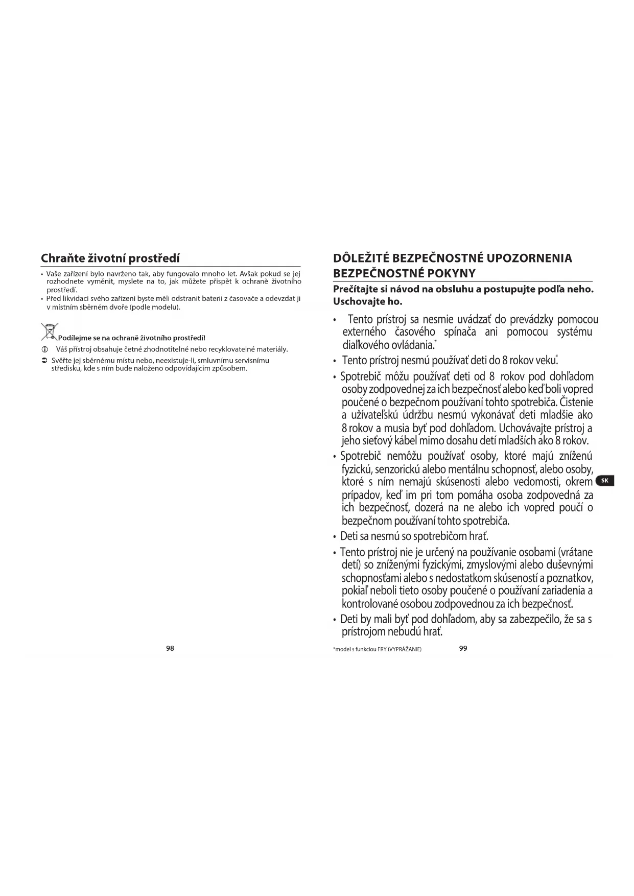- Deti by mali byť pod dohľadom, aby sa zabezpečilo, že sa s prístrojom nebudú hrať. *model sfunkciou FRY (VYPRÁŽANIE) Chraňte životní prostředí