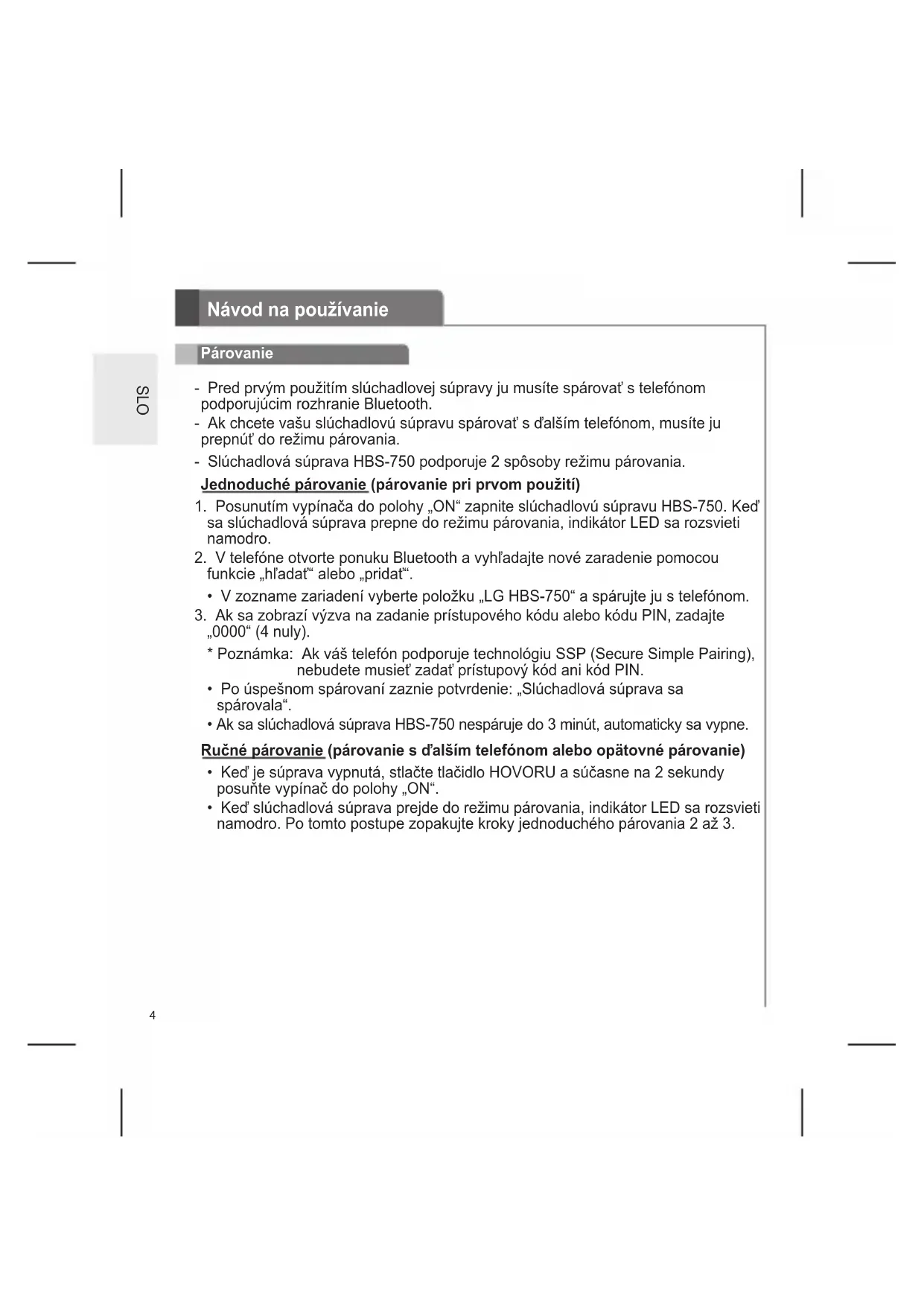 - Ak sa slúchadlová súprava HBS-750 nespáruje do 3 minút, automaticky sa vypne.