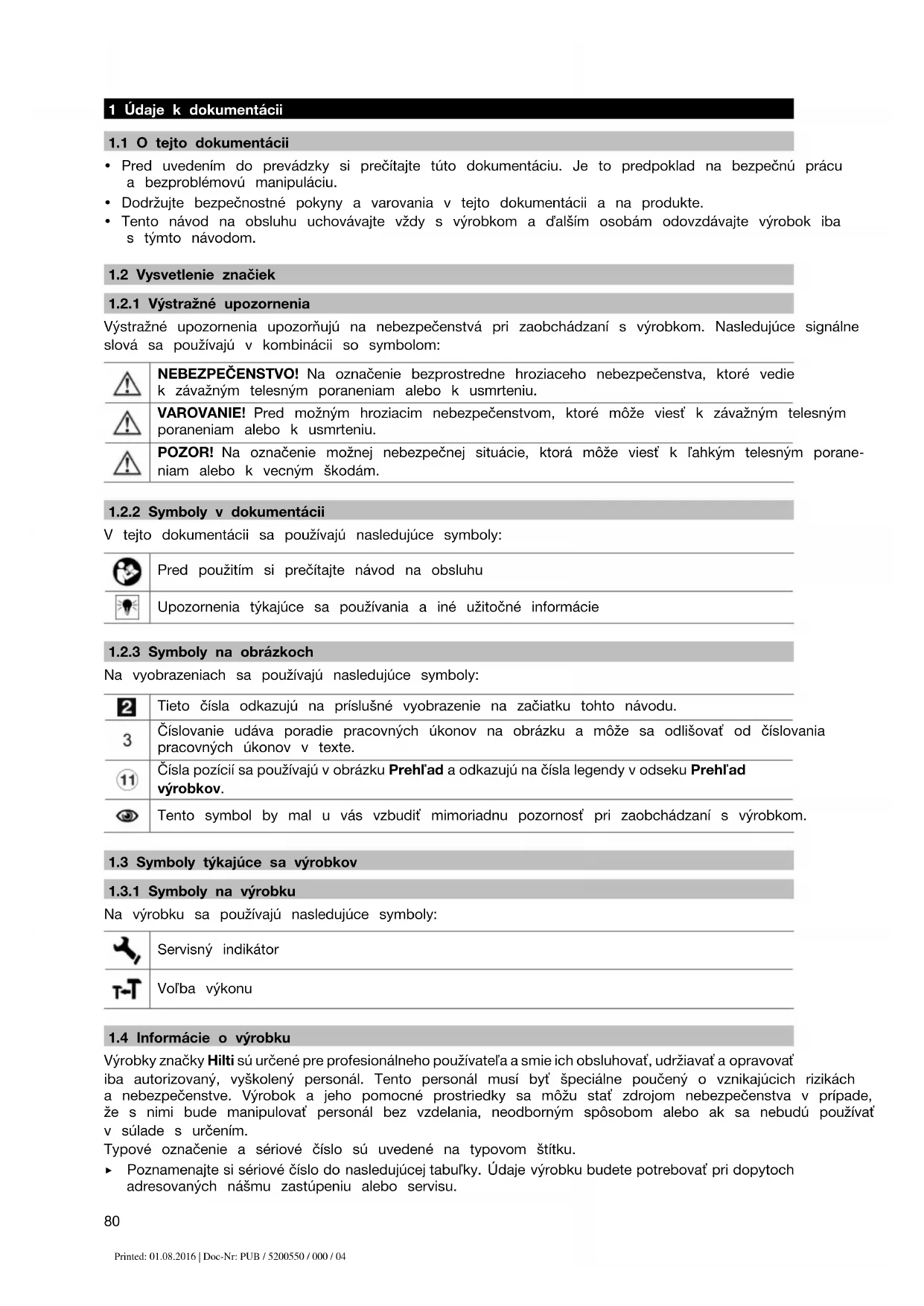 Vyhlasujeme na vlastnú zodpovednosť, že tu opísaný výrobok je v súlade s platnými smernicami a normami. Vyobrazenie vyhlásenia o zhode nájdete na konci tejto dokumentácie. Technická dokumentácia je uložená: Hilti Entwicklungsgesellschaft mbH | Zulassung Werkzeuge | Hiltistraße 6 | 86916 Kaufering, DE 2 Bezpečnosť
