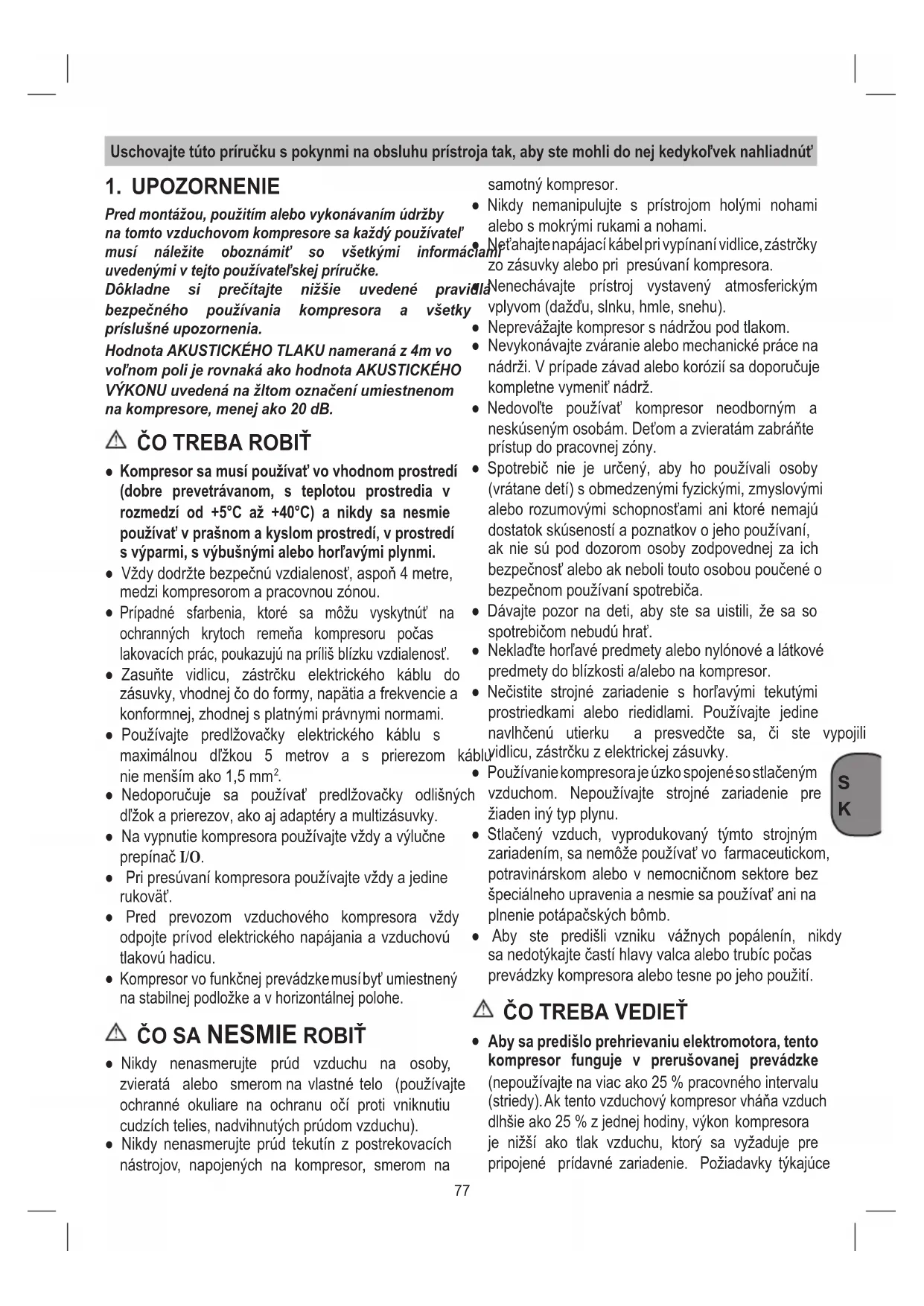 Predmontážou,použitímalebovykonávanímúdržby natomtovzduchovomkompresoresakaždýpoužívateľ musí náležite oboznámiť so všetkými informáciami uvedenýmivtejtopoužívateľskejpríručke. Dôkladne si prečítajte nižšie uvedené pravidlá bezpečného používania kompresora a všetky príslušnéupozornenia. Hodnota AKUSTICKÉHO TLAKU nameraná z 4m vo voľnompolijerovnakáakohodnotaAKUSTICKÉHO VÝKONUuvedenánažltomoznačeníumiestnenom na kompresore, menej ako 20 dB.