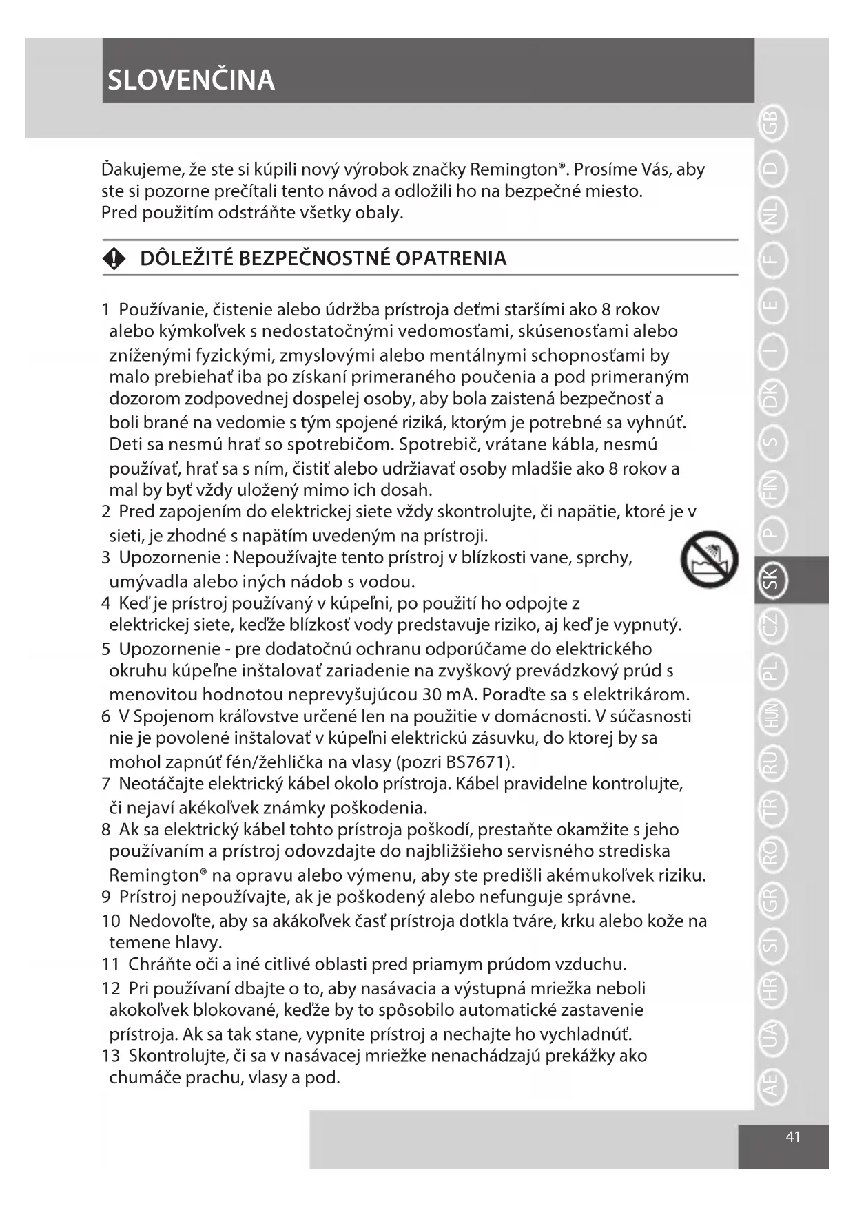 8 Ak sa elektrický kábel tohto prístroja poškodí, prestaňte okamžite s jeho používaním a prístroj odovzdajte do najbližšieho servisného strediska Remington® na opravu alebo výmenu, aby ste predišli akémukol'vek riziku.