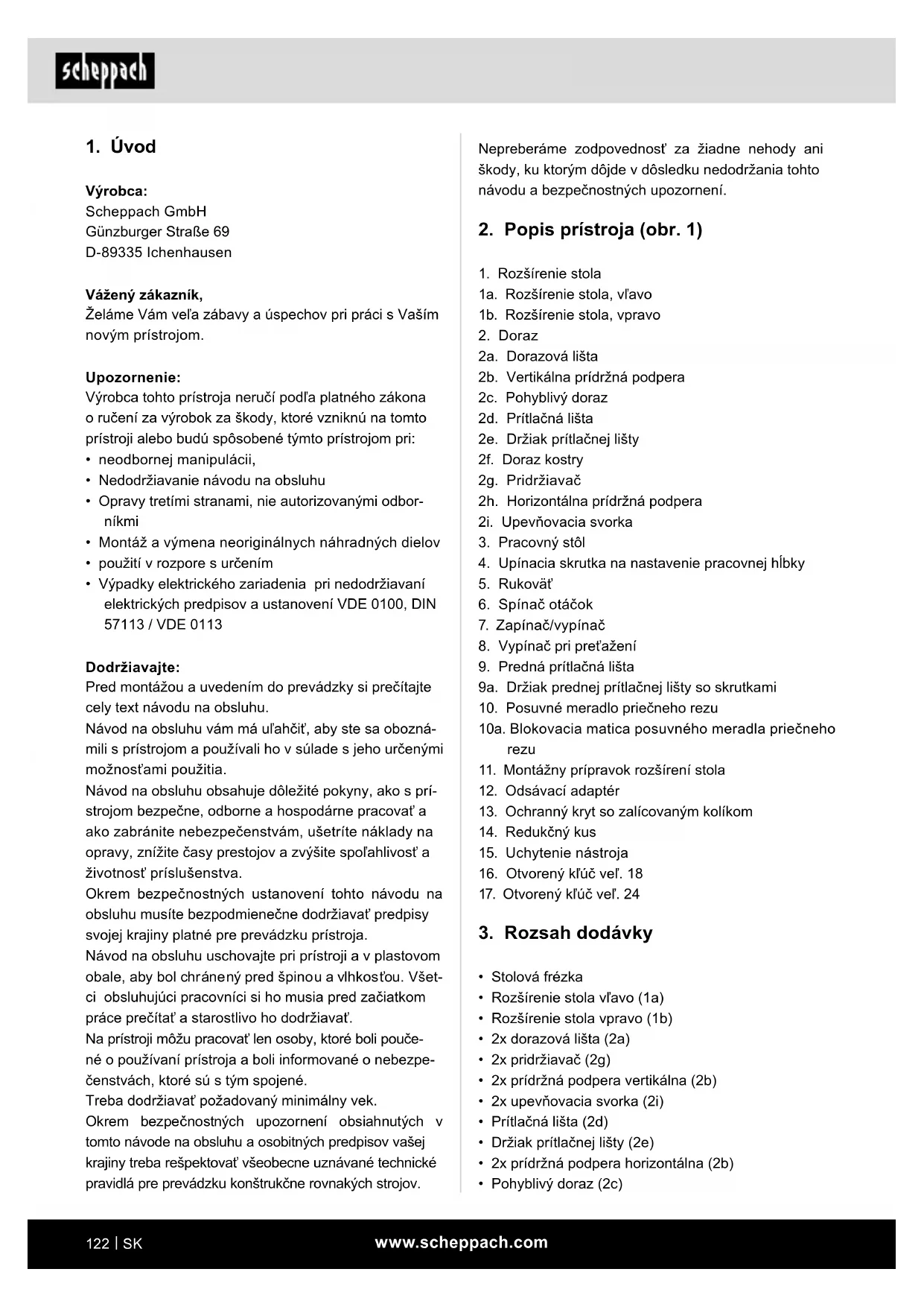 Výrobca: Scheppach GmbH Günzburger Straße 69 D-89335 Ichenhausen Vážený zákazník, Želáme Vám veľa zábavy a úspechov pri práci s Vaším novým prístrojom. Upozornenie: Výrobca tohto prístroja neručí podľa platného zákona o ručení za výrobok za škody, ktoré vzniknú na tomto prístroji alebo budú spôsobené týmto prístrojom pri: