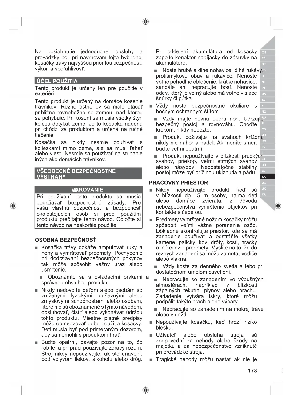 172 | SlovenskoNa dosiahnutie jednoduchej obsluhy a prevádzky boli pri navrhovaní tejto hybridnej kosačky trávy najvyššou prioritou bezpečnosť, výkon a spoľahlivosť.