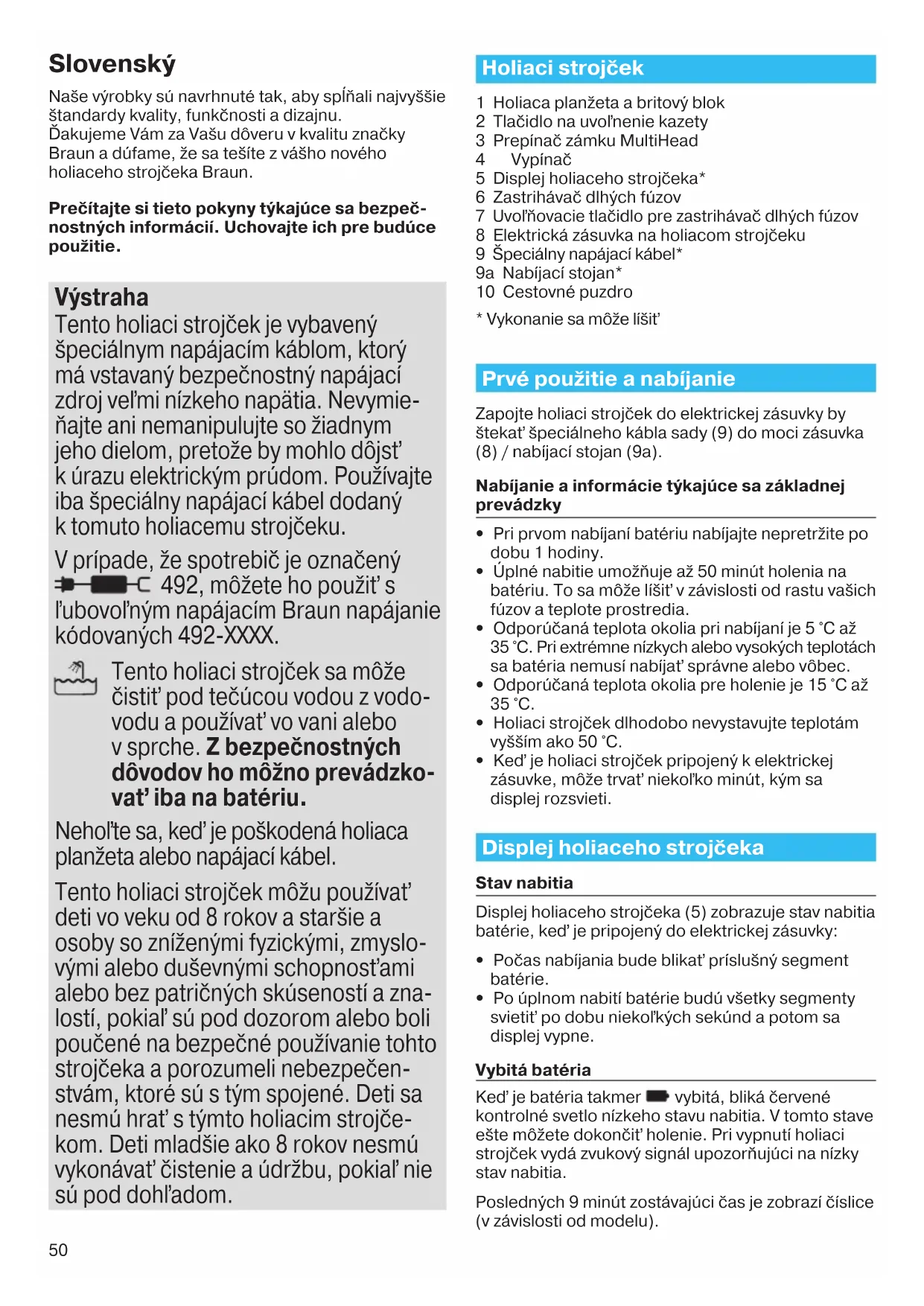 Holicí strojek se vypíná, když je baterie zcela nabitá. Holicí fólie a břitový blok jsou opotřebené, a strojek tak k holení potřebuje vyšší výkon, než jaký dokáže dodat jeho motorek. Přístroj se vypíná. – Vyměňte holicí fólii a břitový blok. – Holicí systém pravidelně olejujte, zejména tehdy, když jej čistíte pouhou vodou. 91154595_Series_9-2_Solo_Euro_S6-96.indd 49 28.11.16 13:0950 Slovensk Naše výrobky sú navrhnuté tak, aby spĺňali najvyššie štandardy kvality, funkčnosti a dizajnu. Ďakujeme Vám za Vašu dôveru v kvalitu značky Braun a dúfame, že sa tešíte z vášho nového holiaceho strojčeka Braun. Prečítajte si tieto pokyny týkajúce sa bezpeč- nostných informácií. Uchovajte ich pre budúce použitie. Výstraha Tento holiaci strojček je vybavený špeciálnym napájacím káblom, ktorý má vstavaný bezpečnostný napájací zdroj veľmi nízkeho napätia. Nevymie- ňajte ani nemanipulujte so žiadnym jeho dielom, pretože by mohlo dôjsť k úrazu elektrickým prúdom. Používajte iba špeciálny napájací kábel dodaný k tomuto holiacemu strojčeku. V prípade, že spotrebič je označený 492, môžete ho použiť s ľubovoľným napájacím Braun napájanie kódovaných 492-XXXX. Tento holiaci strojček sa môže čistiť pod tečúcou vodou z vodo- vodu a používať vo vani alebo v sprche. Z bezpečnostných dôvodov ho môžno prevádzko- vať iba na batériu. Nehoľte sa, keď je poškodená holiaca planžeta alebo napájací kábel. Tento holiaci strojček môžu používať deti vo veku od 8 rokov a staršie a osoby so zníženými fyzickými, zmyslo- vými alebo duševnými schopnosťami alebo bez patričných skúseností a zna- lostí, pokiaľ sú pod dozorom alebo boli poučené na bezpečné používanie tohto strojčeka a porozumeli nebezpečen- stvám, ktoré sú s tým spojené. Deti sa nesmú hrať s týmto holiacim strojče- kom. Deti mladšie ako 8 rokov nesmú vykonávať čistenie a údržbu, pokiaľ nie sú pod dohľadom. Holiaci strojček 1 Holiaca planžeta a britový blok 2 Tlačidlo na uvoľnenie kazety 3 Prepínač zámku MultiHead 4 Vypínač 5 Displej holiaceho strojčeka* 6 Zastrihávač dlhých fúzov 7 Uvoľňovacie tlačidlo pre zastrihávač dlhých fúzov 8 Elektrická zásuvka na holiacom strojčeku 9 Špeciálny napájací kábel* 9a Nabíjací stojan* 10 Cestovné puzdro