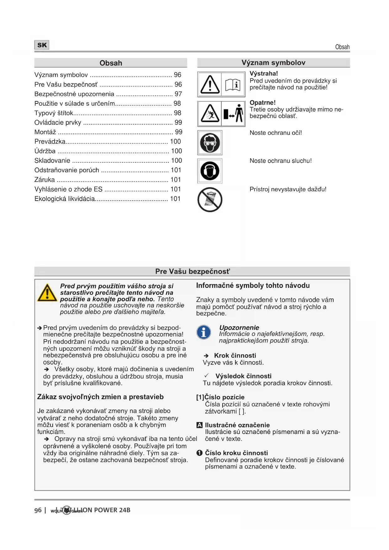 Bezpečnostnéupozornenia Stupnenebezpečenstievvýstražnýchupozor- není V tomto návode na použitie sa používajú nasledu- júce stupne nebezpečenstiev, aby sa upozornilo na potenciálne nebezpečné situácie: NEBEZPEČENSTVO! Bezprostredne hrozí nebezpečná situácia a táto vedie, ak sa nedodržia opatrenia, k ťažkým poraneniam alebo až k smrti. VÝSTRAHA ! Môže sa vyskytnúť nebezpečná situácia a táto vedie, ak sa nedodržia opatrenia, k ťažkým poraneniam alebo až k smrti. OPATRNE ! Môže sa vyskytnúť nebezpečná situácia a táto vedie, ak sa nedodržia opatrenia, k ľahkým alebo k nepatrným poraneniam. Pozor ! Môže sa vyskytnúť pravdepodobne škodlivá situ- ácia a táto vedie, ak sa jej nezabráni, k vecným škodám. Štruktúrabezpečnostnýchupozornení NEBEZPEČENSTVO! Druh a zdroj nebezpečenstva! ÂNásledky pri nedodržaní ¾ Opatrenia na odvrátenie nebezpečen- stva Vlastná ochrana a ochrana osôb ¾ Fúkačlístiatrávnikovnesmúzbezpečnost- nýchdôvodovpoužívaťdetianiosoby,ktoré nepoznajúnávodnapoužitie.Miestne nariade- nia môžu stanovovať minimálny vek používateľa. ¾ Fúkačlístianeuvádzajtedoprevádzky,keďsa v bezprostrednej blízkosti nachádzajú osoby (predovšetkýmdeti)alebozvieratá. Dbajte na to, aby sa deti s fúkačom lístia nehrali. ¾ Preruštepoužitiestroja,keďsavblízkosti nachádzajúosoby(predovšetkýmdeti)alebo domáce zvieratá. Tretie osoby udržiavajte mimo nebezpečnú oblasť. ¾ Tentostrojsanesmiepoužívaťdeťmiani osobamisobmedzenýmitelesnými,senzoric- kýmialeboduševnýmischopnosťamialebo snedostatočnýmiskúsenosťamiavedomos- ťami.Strojtaktiežnesmúpoužívaťosoby, ktoréniesúoboznámenéstýmtonávodom napoužitie.Miestne predpisy môžu stanovovať vekové obmedzenie pre používateľov. ¾ Čistenieaúdržbunesmúvykonávaťdeti. ¾ Priprácachsfúkačomlístiaalebonaňom vždynostepevnúobuvadlhénohavice,ako ajďalšie,príslušnevhodnéosobnéochranné vybavenie (ochranné okuliare, ochranu slu- chu,pracovnérukaviceatď.).Nosenie osobné- ho ochranného vybavenia znižuje riziko poranení. ¾ Osoby,ktoréobsluhujústroj,nesmúbyťpod vplyvomomamnýchprostriedkov(napr.alko- hol, drogy alebo lieky). ¾ Obsluhujúcaosobaalebopoužívateľje zodpovednýzanehodyaleboškodyspôsobe- nýchinýmľuďomaleboichmajetku. Predpoužitím ¾ Predzačiatkomprácesaoboznámtesfúka- čomlístiaasjehofunkciami,akoajsjeho ovládacími prvkami. ¾ Nepoužívajtefúkačlístia,ktorýmáchybný spínačaužhoniejemožnézapnúťalebo vypnúť.Tento nechajte opraviť kvalikovanému odborníkovi alebo v odbornej dielni. ¾ Prečítajtesiadodržiavajtenávodnaobsluhu akumulátoraanabíjačkyakumulátora. Pripoužití ¾ Akumulátor vyberte zo stroja: - vždy keď sa vzdialite od stroja. - pred odstraňovaním blokovaní. - pred kontrolou, čistením alebo prácou na stroji. - po kontakte s cudzím telesom, aby sa stroj pre- kontroloval na poškodenia. - na okamžitú kontrolu, keď stroj začne mimoriad- ne silno vibrovať. ¾ Priprerušeniachprácenenechávajtevyží- načtrávnikovfúkačlístianikdybezdozorua uschovajtehonabezpečnommieste. ¾ Nostevhodnúochranuočíaochranusluchu!Bezpečnostné upozornenia