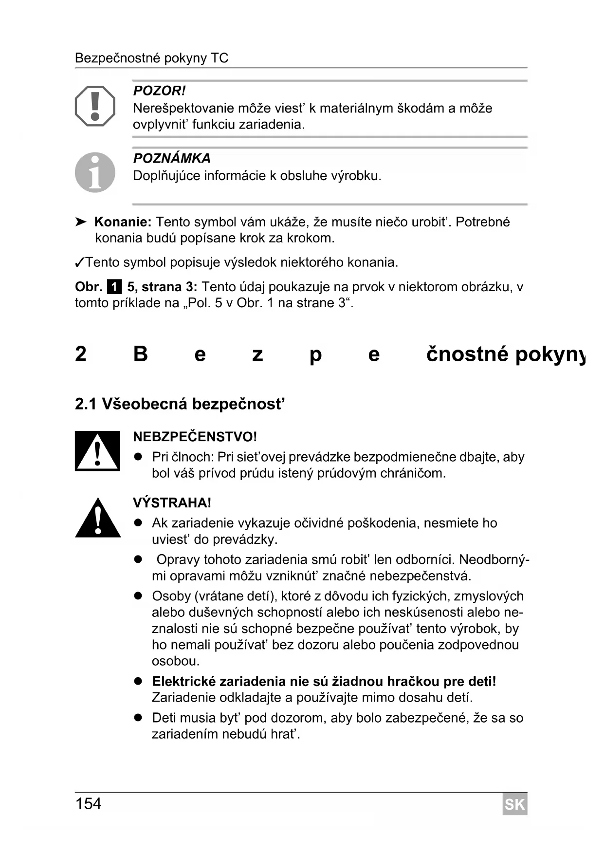 POZNÁMKA Doplňujúce informácie k obsluhe výrobku. ➤ Konanie: Tento symbol vám ukáže, že musíte niečo urobit’. Potrebné konania budú popísane krok za krokom. ✓ Tento symbol popisuje výsledok niektorého konania. Obr. 1 5, strana 3: Tento údaj poukazuje na prvok v niektorom obrázku, v tomto príklade na „Pol. 5 v Obr. 1 na strane 3“. 2Bezpečnostné pokyny