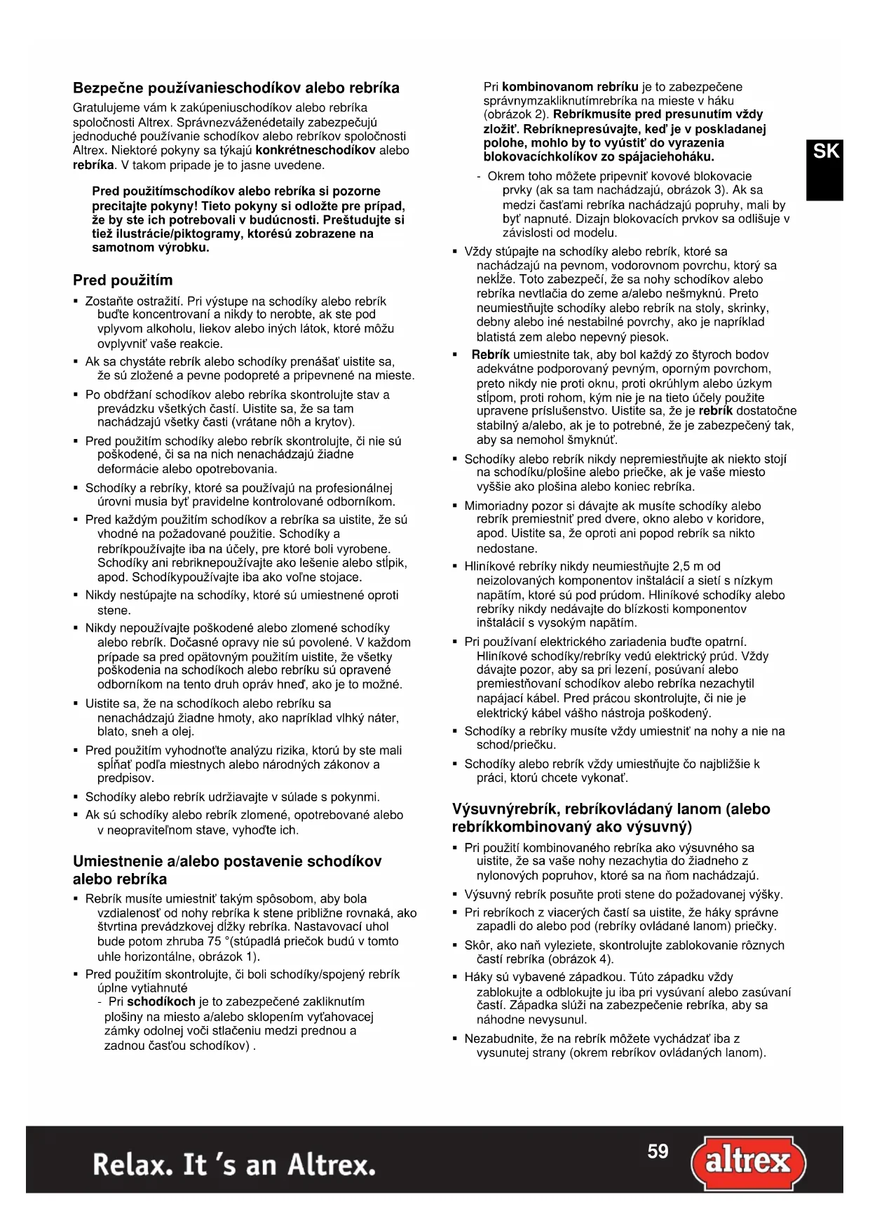 Bezpečne pouţívanieschodíkov alebo rebríka Gratulujeme vám k zakúpeniuschodíkov alebo rebríka spoločnosti Altrex. Správnezváženédetaily zabezpečujú jednoduché používanie schodíkov alebo rebríkov spoločnosti Altrex. Niektoré pokyny sa týkajú konkrétneschodíkov alebo rebríka. V takom pripade je to jasne uvedene. Pred pouţitímschodíkov alebo rebríka si pozorne precitajte pokyny! Tieto pokyny si odloţte pre prípad, ţe by ste ich potrebovali v budúcnosti. Preštudujte si tieţ ilustrácie/piktogramy, ktorésú zobrazene na samotnom výrobku. Pred pouţitím Zostaňte ostražití. Pri výstupe na schodíky alebo rebrík buďte koncentrovaní a nikdy to nerobte, ak ste pod vplyvom alkoholu, liekov alebo iných látok, ktoré môžu ovplyvniť vaše reakcie. Ak sa chystáte rebrík alebo schodíky prenášať uistite sa, že sú zložené a pevne podopreté a pripevnené na mieste. Po obdŕžaní schodíkov alebo rebríka skontrolujte stav a prevádzku všetkých častí. Uistite sa, že sa tam nachádzajú všetky časti (vrátane nôh a krytov). Pred použitím schodíky alebo rebrík skontrolujte, či nie sú poškodené, či sa na nich nenachádzajú žiadne deformácie alebo opotrebovania. Schodíky a rebríky, ktoré sa používajú na profesionálnej úrovni musia byť pravidelne kontrolované odborníkom. Pred každým použitím schodíkov a rebríka sa uistite, že sú vhodné na požadované použitie. Schodíky a rebríkpoužívajte iba na účely, pre ktoré boli vyrobene. Schodíky ani rebriknepoužívajte ako lešenie alebo stĺpik, apod. Schodíkypoužívajte iba ako voľne stojace. Nikdy nestúpajte na schodíky, ktoré sú umiestnené oproti stene. Nikdy nepoužívajte poškodené alebo zlomené schodíky alebo rebrík. Dočasné opravy nie sú povolené. V každom prípade sa pred opätovným použitím uistite, že všetky poškodenia na schodíkoch alebo rebríku sú opravené odborníkom na tento druh opráv hneď, ako je to možné. Uistite sa, že na schodíkoch alebo rebríku sa nenachádzajú žiadne hmoty, ako napríklad vlhký náter, blato, sneh a olej. Pred použitím vyhodnoťte analýzu rizika, ktorú by ste mali spĺňať podľa miestnych alebo národných zákonov a predpisov. Schodíky alebo rebrík udržiavajte v súlade s pokynmi. Ak sú schodíky alebo rebrík zlomené, opotrebované alebo v neopraviteľnom stave, vyhoďte ich. Umiestnenie a/alebo postavenie schodíkov alebo rebríka Rebrík musíte umiestniť takým spôsobom, aby bola vzdialenosť od nohy rebríka k stene približne rovnaká, ako štvrtina prevádzkovej dĺžky rebríka. Nastavovací uhol bude potom zhruba 75 °(stúpadlá priečok budú v tomto uhle horizontálne, obrázok 1). Pred použitím skontrolujte, či boli schodíky/spojený rebrík úplne vytiahnuté - Pri schodíkoch je to zabezpečené zakliknutím plošiny na miesto a/alebo sklopením vyťahovacej zámky odolnej voči stlačeniu medzi prednou a zadnou časťou schodíkov) .