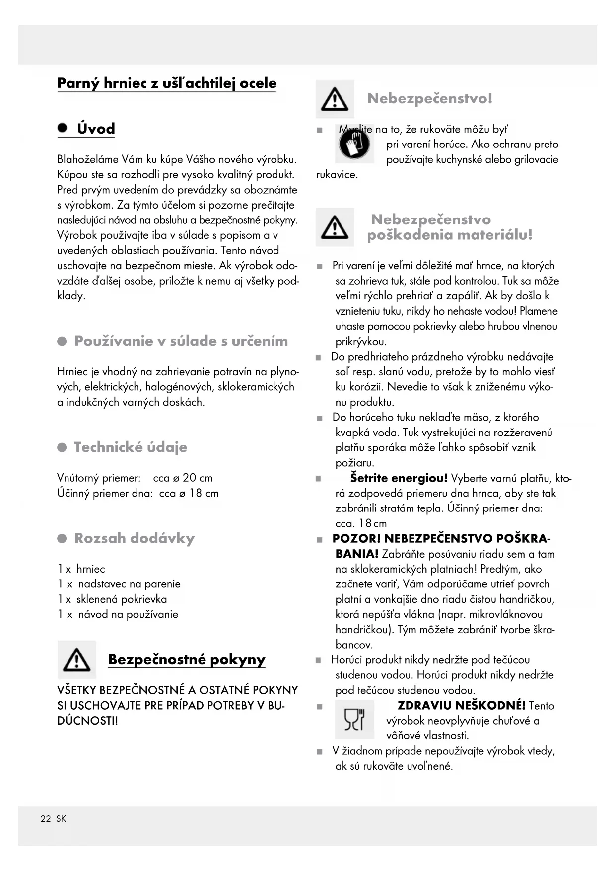 ZDRAVIU NEŠKODNÉ! Tento výrobok neovplyvňuje chuťové a vôňové vlastnosti. J V žiadnom prípade nepoužívajte výrobok vtedy, ak sú rukoväte uvoľnené. Parný hrniec z ušľachtilej ocele Úvod Blahoželáme Vám ku kúpe Vášho nového výrobku. Kúpou ste sa rozhodli pre vysoko kvalitný produkt. Pred prvým uvedením do prevádzky sa oboznámte s výrobkom. Za týmto účelom si pozorne prečítajte nasledujúci návod na obsluhu a bezpečnostné pokyny. Výrobok používajte iba v súlade s popisom a v uvedených oblastiach používania. Tento návod uschovajte na bezpečnom mieste. Ak výrobok odo- vzdáte ďalšej osobe, priložte k nemu aj všetky pod- klady.