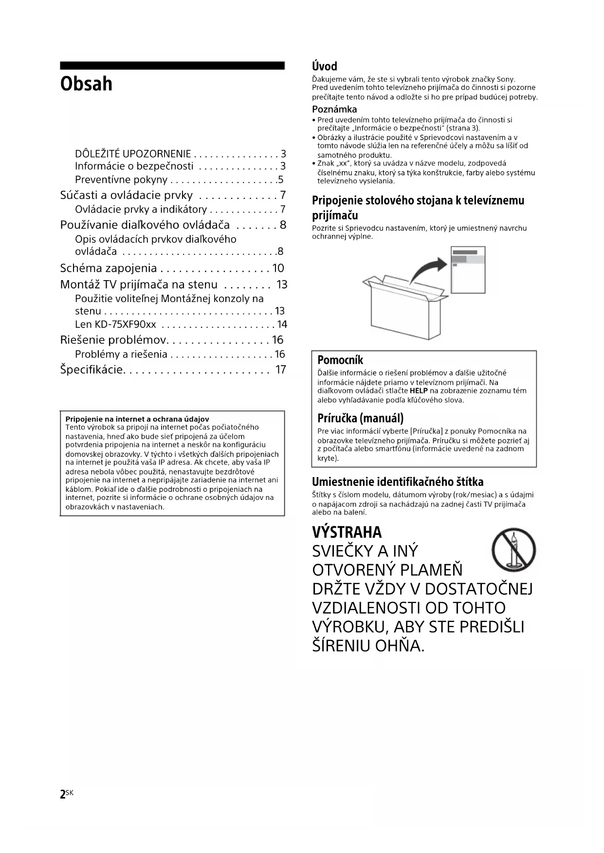 ŠÍRENIU OHŇA. Pripojenie na internet a ochrana údajovTento výrobok sa pripojí na internet počas počiatočného nastavenia, hneď ako bude sieť pripojená za účelom potvrdenia pripojenia na internet a neskôr na konfiguráciu domovskej obrazovky. V týchto i všetkých ďalších pripojeniach na internet je použitá vaša IP adresa. Ak chcete, aby vaša IP adresa nebola vôbec použitá, nenastavujte bezdrôtové pripojenie na internet a nepripájajte zariadenie na internet ani káblom. Pokiaľ ide o ďalšie podrobnosti o pripojeniach na internet, pozrite si informácie o ochrane osobných údajov na obrazovkách v nastaveniach. Pomocník Ďalšie informácie o riešení problémov a ďalšie užitočné informácie nájdete priamo v televíznom prijímači. Na diaľkovom ovládači stlačte HELP na zobrazenie zoznamu tém alebo vyhľadávanie podľa kľúčového slova. Príručka (manuál) Pre viac informácií vyberte [Príručka] z ponuky Pomocníka na obrazovke televízneho prijímača. Príručku si môžete pozrieť aj z počítača alebo smartfónu (informácie uvedené na zadnom kryte).C:\Users\CHAILING_2\Desktop\CU\EU-2\14SK\4733119112_14SK.fm master page: Right KD-75XF90xx / 65XF90xx / 55XF90xx / 49XF90xx 4-733-119-11(2)