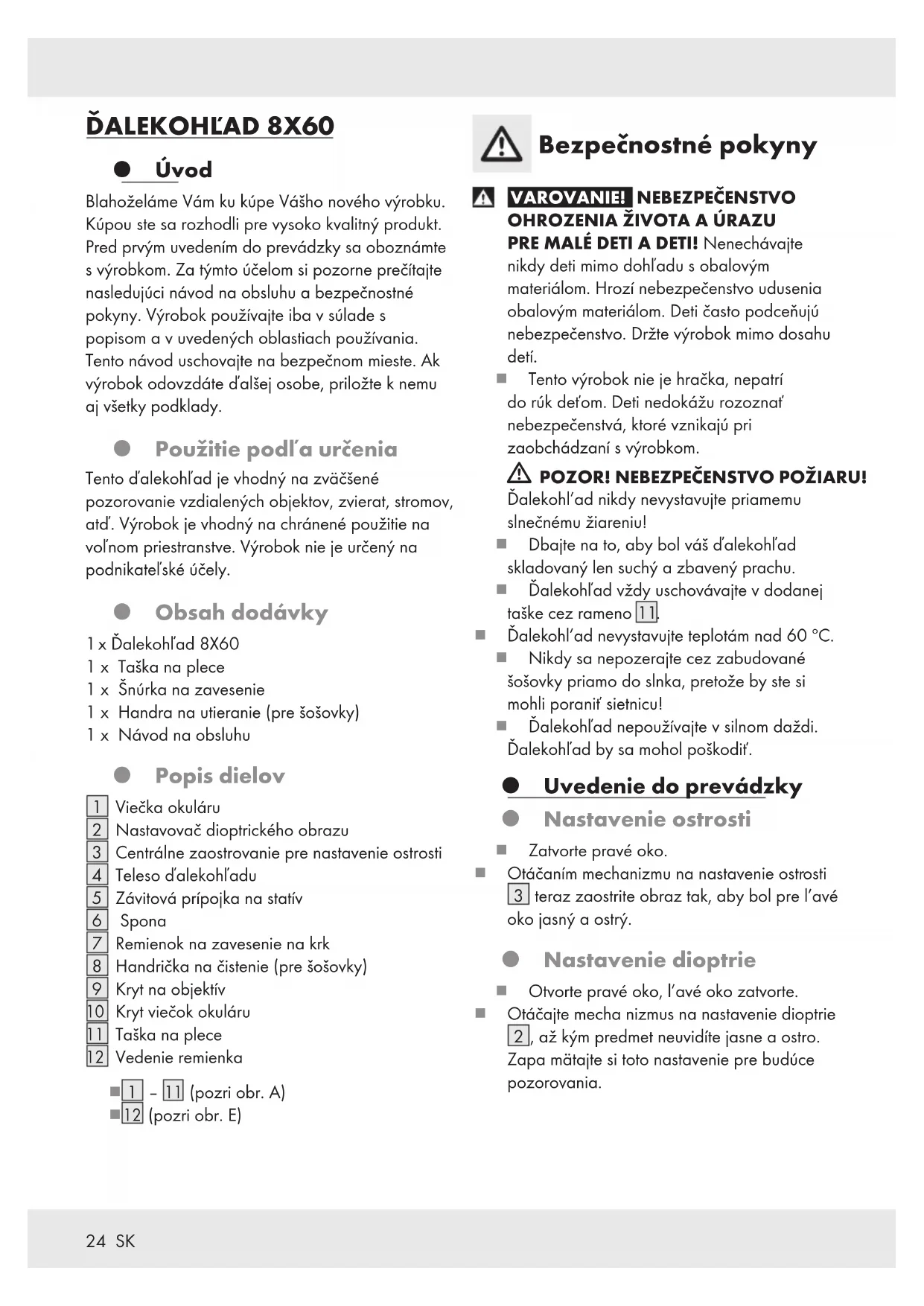Úvod Blahoželáme Vám ku kúpe Vášho nového výrobku. Kúpou ste sa rozhodli pre vysoko kvalitný produkt. Pred prvým uvedením do prevádzky sa oboznámte s výrobkom. Za týmto účelom si pozorne prečítajte nasledujúci návod na obsluhu a bezpečnostné pokyny. Výrobok používajte iba v súlade s popisom a v uvedených oblastiach používania. Tento návod uschovajte na bezpečnom mieste. Ak výrobok odovzdáte ďalšej osobe, priložte k nemu aj všetky podklady. Použitie podľa určenia Tento ďalekohľad je vhodný na zväčšené pozorovanie vzdialených objektov, zvierat, stromov, atď. Výrobok je vhodný na chránené použitie na voľnom priestranstve. Výrobok nie je určený na podnikateľské účely. Obsah dodávky 1 x Ďalekohľad 8X60 1 x Taška na plece 1 x Šnúrka na zavesenie 1 x Handra na utieranie (pre šošovky) 1 x Návod na obsluhu Popis dielov