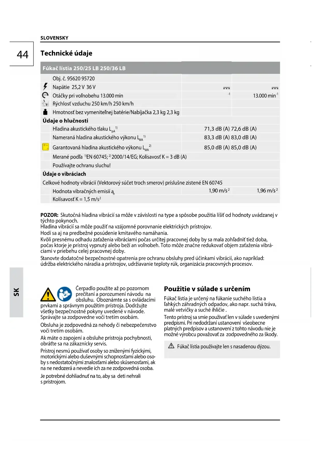 by s nedostatočnými znalosťami alebo skúsenosťami, ak na ne nedo zerá a nevedie ich za ne zodpovedná osoba. Je potrebné dohliadnuť na to, aby sa deti nehrali sprístrojom. Použitie v súlade s určením Fúkač lístia je určený na fúkanie suchého lístia a ľahkých záhradných odpadov, ako napr. suchá tráva, malé vetvičky a suché ihličie . Tento prístroj sa smie použivať len v súlade s uvedenými predpismi. Pri nedodržaní ustanovení všeobecne platných predpisov a ustanovení z tohto návodu nie je možné výrobcu považovať za zodpovedného za škody. Fúkač lístia používajte len s nasadenou dýzou. Technické údaje Fúkač lístia 250/25 LB 250/36 LB Obj. č. 95620 95720 Napätie 25,2 V 36 V min Otáčky pri voľnobehu 13.000 min