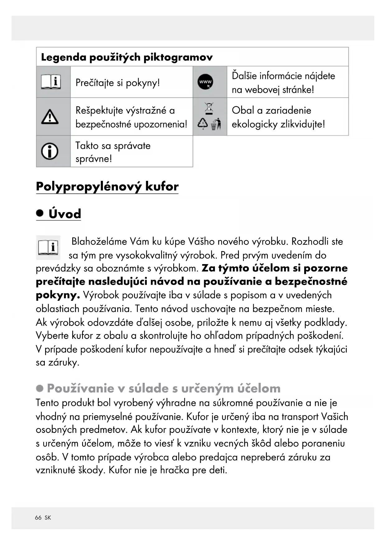 Obal a zariadenie ekologicky zlikvidujte! Takto sa správate správne! Polypropylénový kufor Úvod Blahoželáme Vám ku kúpe Vášho nového výrobku. Rozhodli ste sa tým pre vysokokvalitný výrobok. Pred prvým uvedením do prevádzky sa oboznámte s výrobkom. Za týmto účelom si pozorne prečítajte nasledujúci návod na používanie a bezpečnostné pokyny. Výrobok používajte iba v súlade s popisom a v uvedených oblastiach používania. Tento návod uschovajte na bezpečnom mieste. Ak výrobok odovzdáte ďalšej osobe, priložte k nemu aj všetky podklady. Vyberte kufor z obalu a skontrolujte ho ohľadom prípadných poškodení. V prípade poškodení kufor nepoužívajte a hneď si prečítajte odsek týkajúci sa záruky. Používanie v súlade s určeným účelom Tento produkt bol vyrobený výhradne na súkromné používanie a nie je vhodný na priemyselné používanie. Kufor je určený iba na transport Vašich osobných predmetov. Ak kufor používate v kontexte, ktorý nie je v súlade s určeným účelom, môže to viesť k vzniku vecných škôd alebo poraneniu osôb. V tomto prípade výrobca alebo predajca nepreberá záruku za vzniknuté škody. Kufor nie je hračka pre deti.67 SK Popis častí