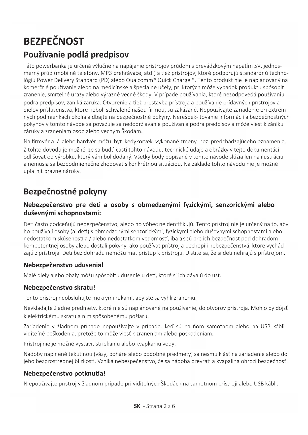 - Technické údaje SK - Strana 1 z 6 Qualcomm Quick Charge je produkt spoločnosti Qualcomm Technologies, Inc. Qualcomm je obchodná značka spoločnosti Qualcomm Incorporated registrovaná v Spojených štátoch a iných krajinách. Quick Charge je obchod- ná značka spoločnosti Qualcomm Incorporated. Všetky značky Qualcomm Incorporated sa používajú s povolením.BEZPEČNOST Používanie podlá predpisov Táto powerbanka je určená výlučne na napájanie prístrojov prúdom s prevádzkovým napäm 5V, jednos- merný prúd (mobilné telefóny, MP3 prehrávače, atď.) a ež prístrojov, ktoré podporujú štandardnú techno- lógiu Power Delivery Standard (PD) alebo Qualcomm® Quick Charge™. Tento produkt nie je naplánovaný na komerčrié používanie alebo na medicínske a špeciálne účely, pri ktorých móže výpadok produktu spósobit zranenie, smrtelné úrazy alebo výrazné vecné škody. V prípade používania, ktoré nezodpovedá používaniu podra predpisov, zaniká záruka. Otvorenie a ež prestavba prístroja a používanie prídavných prístrojov a dielov príslušenstva, ktoré neboli schválené našou rmou, sú zakázané. Nepoužívajte zariadenie pri extrém- nych podmienkach okolia a dbajte na bezpečnostné pokyny. Nerešpek- tovanie informácií a bezpečnostných pokynov v tomto návode sa považuje za nedodržiavanie používania podra predpisov a móže viest k zániku záruky a zraneniam osób alebo vecným Škodám. Na rmvér a / alebo hardvér móžu byt kedykorvek vykonané zmeny bez predchádzajúceho oznámenia. Z tohto dóvodu je možné, že sa budú čas tohto návodu, technické údaje a obrázky v tejto dokumentácii odlišovat od výrobku, ktorý vám bol dodaný. Všetky body popísané v tomto návode slúžia len na ilustráciu a nemusia sa bezpodmienečne zhodovat s konkrétnou situáciou. Na základe tohto návodu nie je možné uplatnit právne nároky. Bezpečnostné pokyny Nebezpečenstvo pre de a osoby s obmedzenými fyzickými, senzorickými alebo duševnými schopnostami: De často podceňujú nebezpečenstvo, alebo ho vóbec neidenkujú. Tento prístroj nie je určený na to, aby ho používali osoby (aj de) s obmedzenými senzorickými, fyzickými alebo duševnými schopnostami alebo nedostatkom skúsenos a / alebo nedostatkom vedomos, iba ak sú pre ich bezpečnost pod dohradom kompetentnej osoby alebo dostali pokyny, ako používat prístroj a pochopili nebezpečenstvá, ktoré vychád- zajú z prístroja. De bez dohradu nemóžu mat prístup k prístroju. Uiste sa, že si de nehrajú s prístrojom. Nebezpečenstvo udusenia! Malé diely alebo obaly môžu spôsobiť udusenie u de, ktoré si ich dávajú do úst. Nebezpečenstvo skratu! Tento prístroj neobsluhujte mokrými rukami, aby ste sa vyhli zraneniu. Nevkladajte žiadne predmety, ktoré nie sú naplánované na používanie, do otvorov prístroja. Mohlo by dôjsť k elektrickému skratu a ním spôsobenému požiaru. Zariadenie v žiadnom prípade nepoužívajte v prípade, keď sú na ňom samotnom alebo na USB kábli viditeľné poškodenia, pretože to môže viesť k zraneniam alebo poškodeniam. Prístroj nie je možné vystavit striekaniu alebo kvapkaniu vody. Nádoby naplnené tekunou (vázy, poháre alebo podobné predmety) sa nesmú klásť na zariadenie alebo do jeho bezprostrednej blízkos. Vzniká nebezpečenstvo, že sa nádoba prevrá a kvapalina ohrozí bezpečnosť. Nebezpečenstvo potknua! N epoužívajte prístroj v žiadnom prípade pri viditelných Škodách na samotnom prístroji alebo USB kábli. SK - Strana 2 z 6Poškodenie! Nepoužívajte prístroj v extrémne chladných, horúcich, vlhkých alebo prašných priestoroch. Nevystavujte prístroj priamemu slnečnému žiareniu. Chráňte produkt pred otvoreným ohňom. Hrozí riziko explózie! Chráňte prístroj v každom prevádzkovom stave pred nárazom a pádom. Tento prístroj je citlivý na elektrostacké výboje. Chráňte preto prístroj pred každým možným elek- trosta- ckým výbojom. Aby sa zabránilo chybným funkciám, nespájajte výstupné prípojky USB prístroja s prípojkami USB počítačov alebo iných prístrojov. Sú určené iba na nabíjanie prístrojov. Aby sa zabránilo prehriau, nezakrývajte ani neblokujte žiadne otvory výrobku. Zariadenie počas jeho prevádzky nikdy úplne nezakrývajte, aby ste zaručili odvádzanie tepla. Neotvárajte kryt zariadenia a zariadenie nedemontujte na jednotlivé súčiastky. Nepokúšajte sa ho sami opraviť. V takýto prípadoch zaniká nárok na záruku. POZOR! Horúci povrch! Pri používaní môže dôjsť počas dlhodobého držania k poraneniu po- kožky horúčavou. Pri používaní sa zvlášť vyhnite dlhodobému držaniu v oblasach, v ktorých dochádza k silnému zahrievaniu. Počas používania nemajte zariadenie priamo na tele. Po vychladnu zariadenia, sa ho môžete dlhodobo dotýkať. Vyhlásenie o zhode Symbol CE preukazuje, že výrobok spíňa požiadavky všetlrych smerníc EÚ pre daný výrobok. p. 6