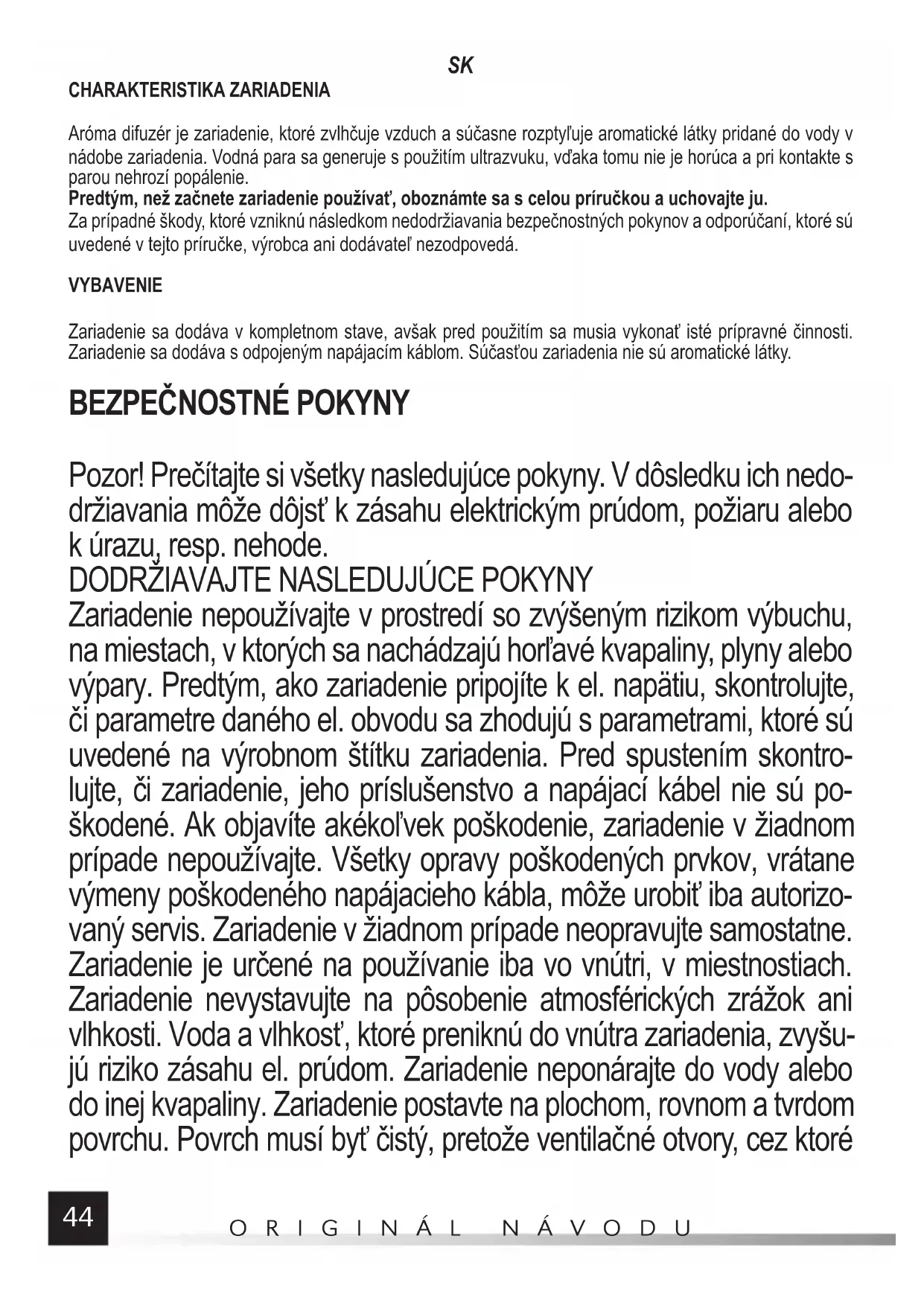 CHARAKTERISTIKA ZARIADENIA Aróma difuzér je zariadenie, ktoré zvlhčuje vzduch a súčasne rozptyľuje aromatické látky pridané do vody v nádobe zariadenia. Vodná para sa generuje s použitím ultrazvuku, vďaka tomu nie je horúca a pri kontakte s parou nehrozí popálenie. Predtým, než začnete zariadenie používať, oboznámte sa s celou príručkou a uchovajte ju. Za prípadné škody, ktoré vzniknú následkom nedodržiavania bezpečnostných pokynov a odporúčaní, ktoré sú uvedené v tejto príručke, výrobca ani dodávateľ nezodpovedá. VYBAVENIE Zariadenie sa dodáva v kompletnom stave, avšak pred použitím sa musia vykonať isté prípravné činnosti. Zariadenie sa dodáva s odpojeným napájacím káblom. Súčasťou zariadenia nie sú aromatické látky.