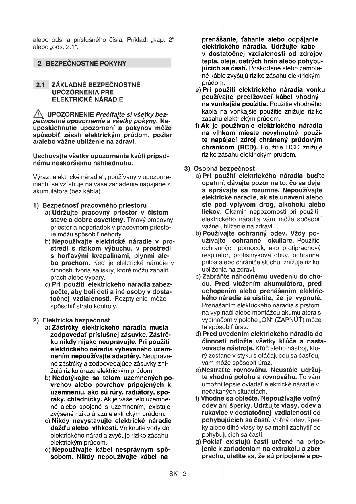 Návod je rozdelený do kapitol a odsekov. Názov odseku „2.1 Inštruktáž“ je podnázvom kapitoly „2. Bezpečnostné pokyny“. Odkazy na názvy a odseky sú uvedené prostredníctvom skratky kap.SK - 2 alebo ods. a príslušného čísla. Príklad: „kap. 2“ alebo „ods. 2.1“.