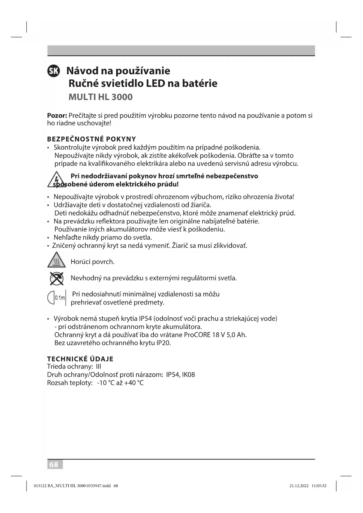 - Výrobok nemá stupeň krytia IP54 (odolnosť voči prachu a striekajúcej vode) - pri odstránenom ochrannom kryte akumulátora. Ochranný kryt a dá používať iba do vrátane ProCORE 18 V 5,0 Ah. Bez uzavretého ochranného krytu IP20. TECHNICKÉ ÚDAJE Trieda ochrany: III Druh ochrany/Odolnosť proti nárazom: IP54, IK08 Rozsah teploty: -10 °C až +40 °C 013122 BA_MULTI HL 3000 0533947.indd 68013122 BA_MULTI HL 3000 0533947.indd 68 21.12.2022 11:05:3221.12.2022 11:05:3269 MULTI HL 3000 Návod na používanie Typ: MULTI HL 3000 Kompatibilné typy akumulátorov: Prehľad všetkých dostupných adaptérov a zodpovedajúcich batérií nájdete na našej domovskej stránke www.brennenstuhl.com Max. projektovaná plocha: 183,63 cm