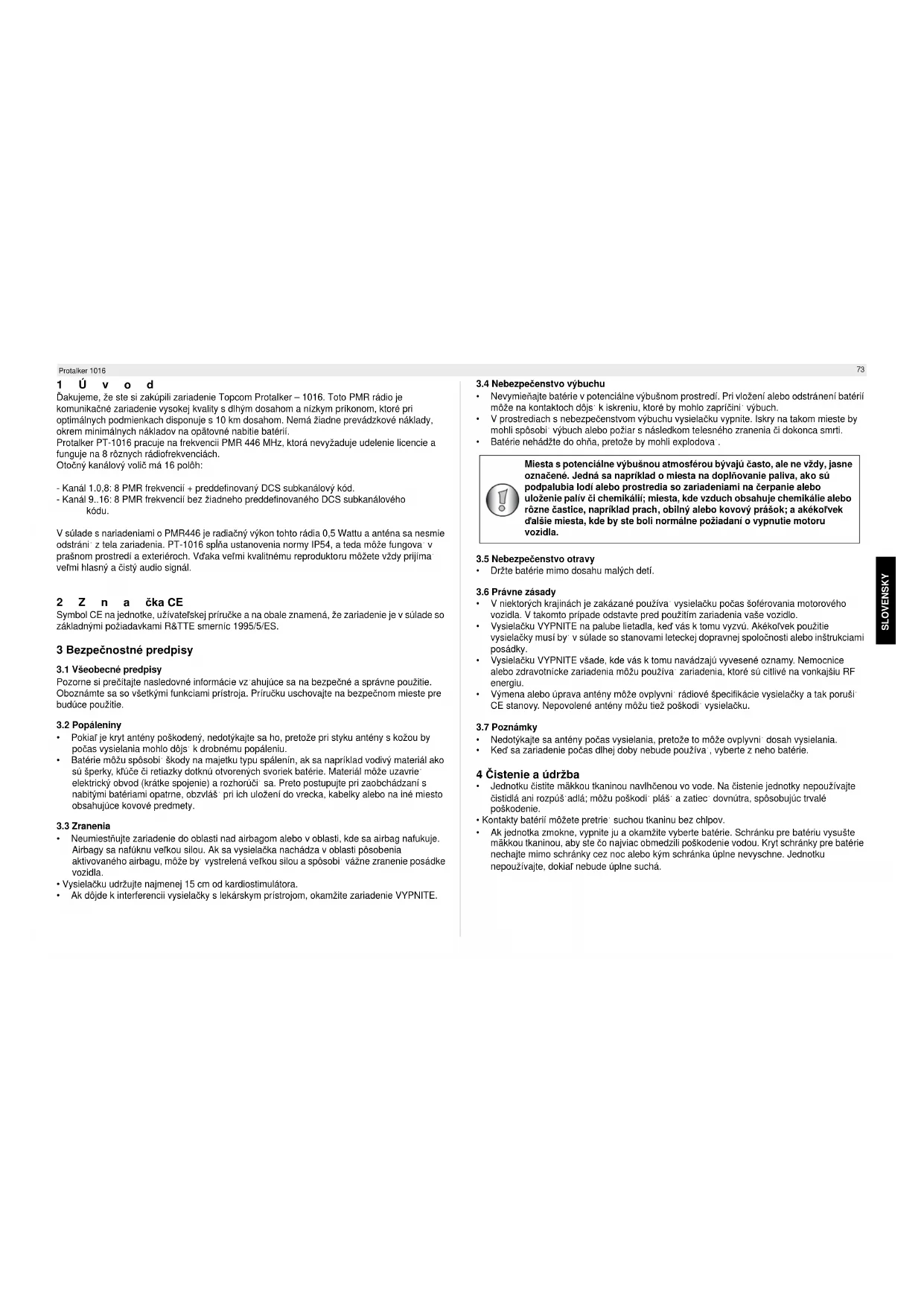 Protalker 1016 1Úvod Ďakujeme, že ste si zakúpili zariadenie Topcom Protalker – 1016. Toto PMR rádio je komunikačné zariadenie vysokej kvality s dlhým dosahom a nízkym príkonom, ktoré pri optimálnych podmienkach disponuje s 10 km dosahom. Nemá žiadne prevádzkové náklady, okrem minimálnych nákladov na opätovné nabitie batérií. Protalker PT-1016 pracuje na frekvencii PMR 446 MHz, ktorá nevyžaduje udelenie licencie a funguje na 8 rôznych rádiofrekvenciách. Otočný kanálový volič má 16 polôh: - Kanál 1.0,8: 8 PMR frekvencií + preddefinovaný DCS subkanálový kód. - Kanál 9..16: 8 PMR frekvencií bez žiadneho preddefinovaného DCS subkanálového kódu. V súlade s nariadeniami o PMR446 je radiačný výkon tohto rádia 0,5 Wattu a anténa sa nesmie odstráni˙ z tela zariadenia. PT-1016 spĺňa ustanovenia normy IP54, a teda môže fungova˙ v prašnom prostredí a exteriéroch. Vďaka veľmi kvalitnému reproduktoru môžete vždy prijíma˙ veľmi hlasný a čistý audio signál. 2Značka CE Symbol CE na jednotke, užívateľskej príručke a na obale znamená, že zariadenie je v súlade so základnými požiadavkami R&TTE smerníc 1995/5/ES. 3 Bezpečnostné predpisy