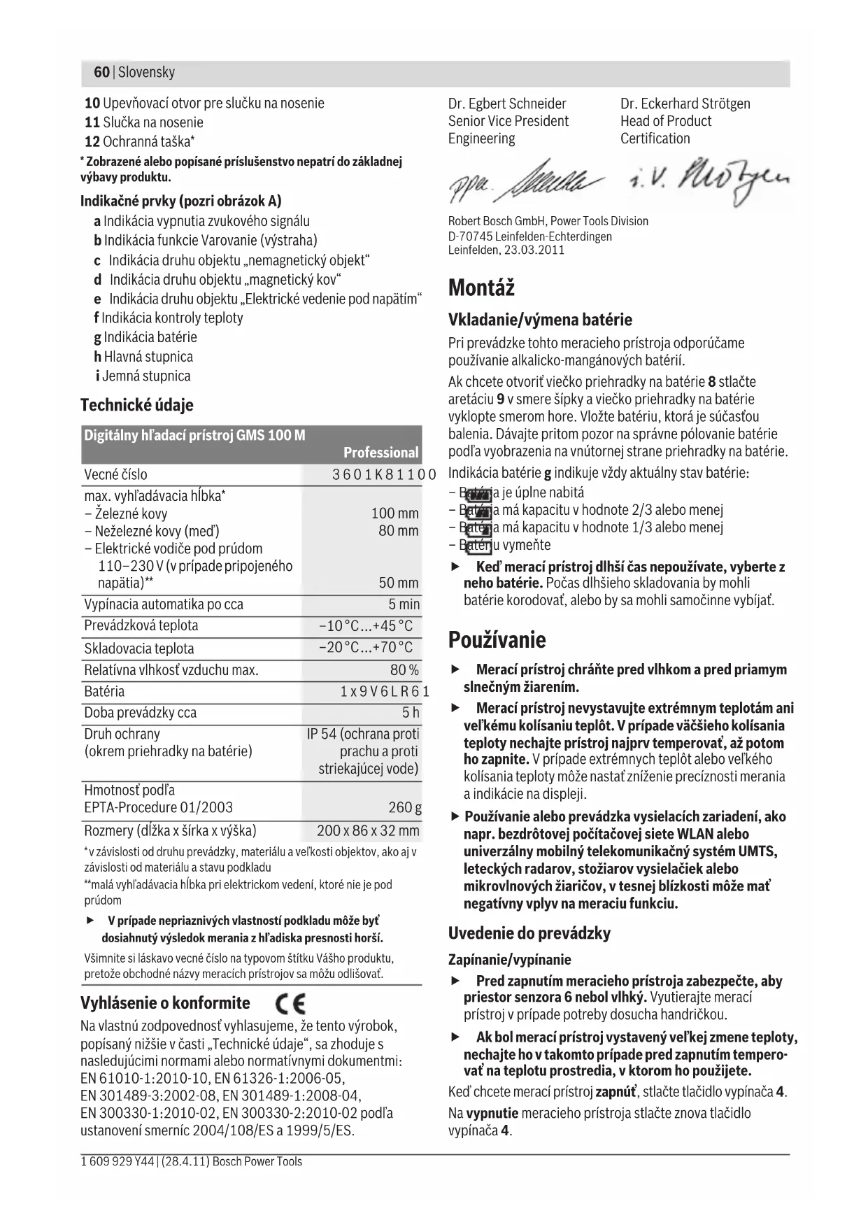- Zobrazené alebo popísané príslušenstvo nepatrí do základnej výbavy produktu. Indikačné prvky (pozri obrázok A) a Indikácia vypnutia zvukového signálu b Indikácia funkcie Varovanie (výstraha) c Indikácia druhu objektu „nemagnetický objekt“ d Indikácia druhu objektu „magnetický kov“ e Indikácia druhu objektu „Elektrické vedenie pod napätím“ f Indikácia kontroly teploty g Indikácia batérie h Hlavná stupnica i Jemná stupnica Technické údaje Vyhlásenie o konformite Na vlastnú zodpovednosť vyhlasujeme, že tento výrobok, popísaný nižšie v časti „Technické údaje“, sa zhoduje s nasledujúcimi normami alebo normatívnymi dokumentmi: EN 61010-1:2010-10, EN 61326-1:2006-05, EN 301489-3:2002-08, EN 301489-1:2008-04, EN 300330-1:2010-02, EN 300330-2:2010-02 podľa ustanovení smerníc 2004/108/ES a 1999/5/ES. Robert Bosch GmbH, Power Tools Division D-70745 Leinfelden-Echterdingen Leinfelden, 23.03.2011 Montáž Vkladanie/výmena batérie Pri prevádzke tohto meracieho prístroja odporúčame používanie alkalicko-mangánových batérií. Ak chcete otvoriť viečko priehradky na batérie 8 stlačte aretáciu 9 v smere šípky a viečko priehradky na batérie vyklopte smerom hore. Vložte batériu, ktorá je súčasťou balenia. Dávajte pritom pozor na správne pólovanie batérie podľa vyobrazenia na vnútornej strane priehradky na batérie. Indikácia batérie g indikuje vždy aktuálny stav batérie: – Batéria je úplne nabitá – Batéria má kapacitu v hodnote 2/3 alebo menej – Batéria má kapacitu v hodnote 1/3 alebo menej – Batériu vymeňte f Keď merací prístroj dlhší čas nepoužívate, vyberte z neho batérie. Počas dlhšieho skladovania by mohli batérie korodovať, alebo by sa mohli samočinne vybíjať. Používanie f Merací prístroj chráňte pred vlhkom a pred priamym slnečným žiarením. f Merací prístroj nevystavujte extrémnym teplotám ani veľkému kolísaniu teplôt. V prípade väčšieho kolísania teploty nechajte prístroj najprv temperovať, až potom ho zapnite. V prípade extrémnych teplôt alebo veľkého kolísania teploty môže nastať zníženie precíznosti merania a indikácie na displeji. f Používanie alebo prevádzka vysielacích zariadení, ako napr. bezdrôtovej počítačovej siete WLAN alebo univerzálny mobilný telekomunikačný systém UMTS, leteckých radarov, stožiarov vysielačiek alebo mikrovlnových žiaričov, v tesnej blízkosti môže mať negatívny vplyv na meraciu funkciu. Uvedenie do prevádzky Zapínanie/vypínanie f Pred zapnutím meracieho prístroja zabezpečte, aby priestor senzora 6 nebol vlhký. Vyutierajte merací prístroj v prípade potreby dosucha handričkou. f Ak bol merací prístroj vystavený veľkej zmene teploty, nechajte ho v takomto prípade pred zapnutím tempero- vať na teplotu prostredia, v ktorom ho použijete. Keď chcete merací prístroj zapnúť, stlačte tlačidlo vypínača 4. Na vypnutie meracieho prístroja stlačte znova tlačidlo vypínača 4. Digitálny hľadací prístroj GMS 100 M Professional Vecné číslo 3601K81100 max. vyhľadávacia hĺbka* – Železné kovy – Neželezné kovy (meď) – Elektrické vodiče pod prúdom 110–230 V (v prípade pripojeného napätia)** 100 mm 80 mm 50 mm Vypínacia automatika po cca 5min Prevádzková teplota –10 °C...+45 °C Skladovacia teplota –20 °C...+70 °C Relatívna vlhkosť vzduchu max. 80 % Batéria 1x9V6LR61 Doba prevádzky cca