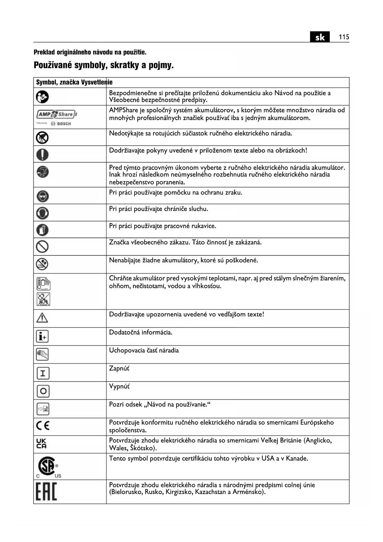 | EAC | Potvrduje zhodu elektrického náradia s národnými predpismi colnej únie (Bielorusko, Rusko, Kirgizsko, Kazachstan a Arménsko). |