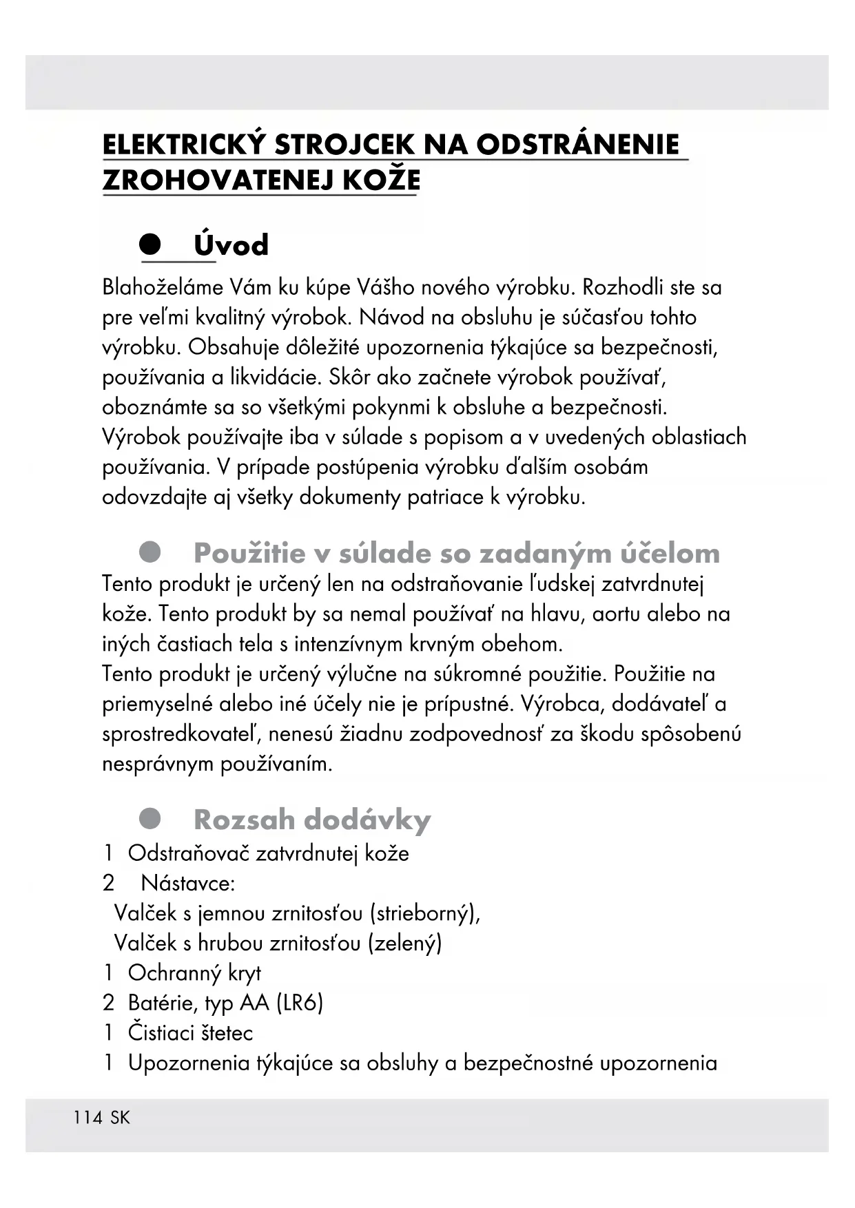 Úvod Blahoželáme Vám ku kúpe Vášho nového výrobku. Rozhodli ste sa pre veľmi kvalitný výrobok. Návod na obsluhu je súčasťou tohto výrobku. Obsahuje dôležité upozornenia týkajúce sa bezpečnosti, používania a likvidácie. Skôr ako začnete výrobok používať, oboznámte sa so všetkými pokynmi k obsluhe a bezpečnosti. Výrobok používajte iba v súlade s popisom a v uvedených oblastiach používania. V prípade postúpenia výrobku ďalším osobám odovzdajte aj všetky dokumenty patriace k výrobku. Použitie v súlade so zadaným účelom Tento produkt je určený len na odstraňovanie ľudskej zatvrdnutej kože. Tento produkt by sa nemal používať na hlavu, aortu alebo na iných častiach tela s intenzívnym krvným obehom. Tento produkt je určený výlučne na súkromné použitie. Použitie na priemyselné alebo iné účely nie je prípustné. Výrobca, dodávateľ a sprostredkovateľ, nenesú žiadnu zodpovednosť za škodu spôsobenú nesprávnym používaním. Rozsah dodávky 1 Odstraňovač zatvrdnutej kože 2 Nástavce: Valček s jemnou zrnitosťou (strieborný), Valček s hrubou zrnitosťou (zelený) 1 Ochranný kryt 2 Batérie, typ AA (LR6) 1 Čistiaci štetec 1 Upozornenia týkajúce sa obsluhy a bezpečnostné upozornenia115
