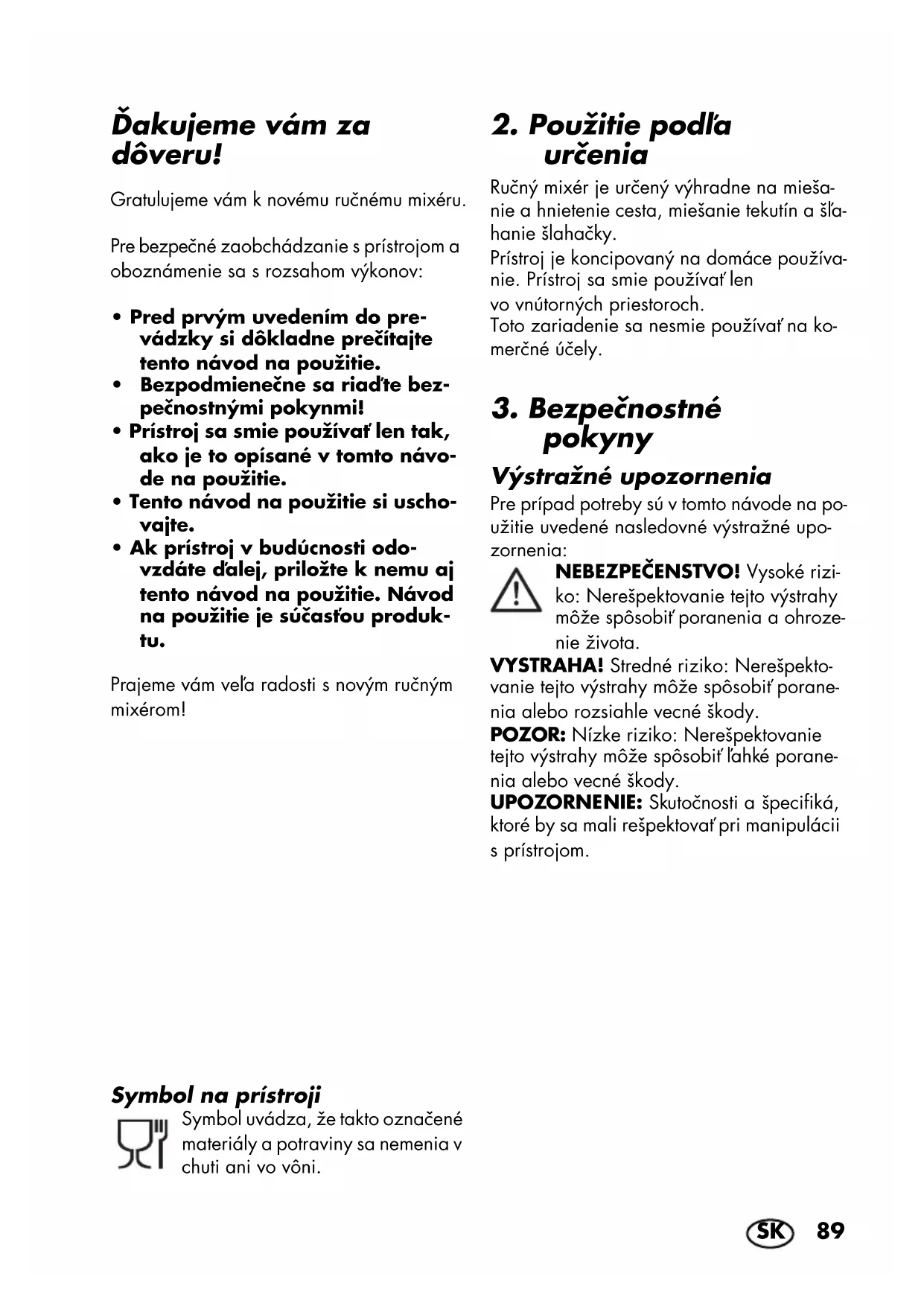 - Ak prístroj v budúcnosti odo- vzdáte ďalej, priložte k nemu aj tento návod na použitie. Návod na použitie je súčasťou produk- tu. Prajeme vám veľa radosti s novým ručným mixérom! Symbol na prístroji Symbol uvádza, že takto označené materiály a potraviny sa nemenia v chuti ani vo vôni.