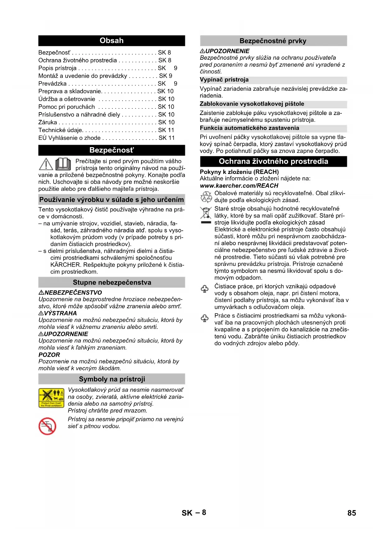 91 dB(A) Dimensiuni şi masa Lungime 280 280 mm Lăţime 176 242 mm Înălţime 443 783 mm Greutate în stare de funcţionare cu accesorii 4,7 5,6 5,8 kg Se rezervă dreptul la modificări tehnice. Declaraţie UE de conformitate Produs: Aparat de curăţare sub presiune Tip: 1.673-xxx Directive UE respectate: 2000/14/CE 2014/30/UE 2006/42/CE (+2009/127/CE) 2011/65/UE Norme armonizate utilizate: EN 50581 EN 55014–1: 2006+A1: 2009+A2: 2011 EN 55014–2: 2015 EN 60335–1 EN 60335–2–79 EN 61000–3–2: 2014 EN 61000–3–3: 2013 EN 62233: 2008 Procedura de evaluare a conformităţii: 2000/14/CE: Anexa V Nivel de zgomot dB(A) măsurat: 89 garantat: 91 CEO Head of Approbation 84 RO– 8 Prečítajte si pred prvým použitím vášho prístroja tento originálny návod na použí- vanie a priložené bezpečnostné pokyny. Konajte podľa nich. Uschovajte si oba návody pre možné neskoršie použitie alebo pre ďalšieho majiteľa prístroja. Tento vysokotlakový čistič používajte výhradne na prá- ce v domácnosti. – na umývanie strojov, vozidiel, stavieb, náradia, fa- sád, terás, záhradného náradia atď. spolu s vyso- kotlakovým prúdom vody (v prípade potreby s pri- daním čistiacich prostriedkov). – s dielmi príslušenstva, náhradnými dielmi a čistia- cimi prostriedkami schválenými spoločnosťou KÄRCHER. Rešpektujte pokyny priložené k čistia- cim prostriedkom. NEBEZPEČENSTVO Upozornenie na bezprostredne hroziace nebezpečen- stvo, ktoré môže spôsobiť vážne zranenia alebo smrť. 몇 VÝSTRAHA Upozornenie na možnú nebezpečnú situáciu, ktorá by mohla viesť k vážnemu zraneniu alebo smrti. 몇 UPOZORNENIE Upozornenie na možnú nebezpečnú situáciu, ktorá by mohla viesť k ľahkým zraneniam. POZOR Pozornenie na možnú nebezpečnú situáciu, ktorá by mohla viesť k vecným škodám. 몇 UPOZORNENIE Bezpečnostné prvky slúžia na ochranu používateľa pred poranením a nesmú byť zmenené ani vyradené z činnosti. Vypínač zariadenia zabraňuje nezávislej prevádzke za- riadenia. Zaistenie zablokuje páku vysokotlakovej pištole a za- braňuje neúmyselnému spusteniu prístroja. Pri uvoľnení páčky vysokotlakovej pištole sa vypne tla- kový spínač čerpadla, ktorý zastaví vysokotlakový prúd vody. Po potiahnutí páčky sa znova zapne čerpadlo. Pokyny k zloženiu (REACH) Aktuálne informácie o zložení nájdete na: www.kaercher.com/REACH Obsah Bezpečnosť . . . . . . . . . . . . . . . . . . . . . . . . . . SK 8 Ochrana životného prostredia . . . . . . . . . . . . SK 8 Popis prístroja . . . . . . . . . . . . . . . . . . . . . . . . SK9 Montáž a uvedenie do prevádzky . . . . . . . . . SK 9 Prevádzka . . . . . . . . . . . . . . . . . . . . . . . . . . . SK9 Preprava a skladovanie. . . . . . . . . . . . . . . . . SK 10 Údržba a ošetrovanie . . . . . . . . . . . . . . . . . . SK 10 Pomoc pri poruchách . . . . . . . . . . . . . . . . . . SK 10 Príslušenstvo a náhradné diely . . . . . . . . . . . SK 10 Záruka . . . . . . . . . . . . . . . . . . . . . . . . . . . . . . SK 10 Technické údaje. . . . . . . . . . . . . . . . . . . . . . . SK 11 EÚ Vyhlásenie o zhode . . . . . . . . . . . . . . . . . SK 11 Bezpečnosť Používanie výrobku v súlade s jeho určením Stupne nebezpečenstva Symboly na prístroji Vysokotlakový prúd sa nesmie nasmerovať na osoby, zvieratá, aktívne elektrické zaria- denia alebo na samotný prístroj. Prístroj chráňte pred mrazom. Prístroj sa nesmie pripojiť priamo na verejnú sieť s pitnou vodou. Bezpečnostné prvky Vypínač prístroja Zablokovanie vysokotlakovej pištole Funkcia automatického zastavenia Ochrana životného prostredia Obalové materiály sú recyklovateľné. Obal zlikvi- dujte podľa ekologických zásad. Staré stroje obsahujú hodnotné recyklovateľné látky, ktoré by sa mali opäť zužitkovať. Staré prí- stroje likvidujte podľa ekologických zásad Elektrické a elektronické prístroje často obsahujú súčasti, ktoré môžu pri nesprávnom zaobchádza- ní alebo nesprávnej likvidácii predstavovať poten- ciálne nebezpečenstvo pre ľudské zdravie a život- né prostredie. Tieto súčasti sú však potrebné pre správnu prevádzku prístroja. Prístroje označené týmto symbolom sa nesmú likvidovať spolu s do- movým odpadom. Čistiace práce, pri ktorých vznikajú odpadové vody s obsahom oleja, napr. pri čistení motora, čistení podlahy prístroja, sa môžu vykonávať iba v umyvárkach s odlučovačom oleja. Práce s čistiacimi prostriedkami sa môžu vykoná- vať iba na pracovných plochách utesnených proti kvapaline a s pripojením do kanalizácie na znečis- tenú vodu. Zabráňte úniku čistiacich prostriedkov do vodných zdrojov alebo pôdy. 85SK– 9 Rozsah dodávky zariadenia (v závislosti od modelu) je znázornený na obale. Tento návod na obsluhu popisuje všetky možné voliteľné vybavenia. Obrázky sú uvedené na stranách s obrázkami 1 Vysokotlaková prípojka 2 Vypínač zariadenia „0/OFF“ / „I/ON“ 3 Hák pre uschovanie 4 Rukoväť 5 Prenosný držiak 6 Prípojka vody so zabudovaným sitkom 7 Vysávacia hadica na čistiaci prostriedok s filtrom na čistiaci prostriedok a kryt 8 Nádrž čistiaceho prostriedku 9 Spojovací diel na pripojenie prívodu vody 10 Uloženie trysky 11 Uschovanie vysokotlakovej pištole 12 Prípojka siete so sieťovou zástrčkou 13 Prepravné koliesko 14 Vysokotlaková pištoľ 15 Zablokovanie vysokotlakovej pištole 16 Svorka vysokotlakovej hadice 17 Vysokotlaková hadica Obrázky sú uvedené na stranách s obrázkami Obrázky - Pred uvedením zariadenia do prevádzky namontuj- te dielce voľne priložené k zariadeniu. Prístroj postavte na rovnú plochu. Obrázky - Z vysokotlakovej pištole vytiahnite svorku a vyso- kotlakovú hadicu zasuňte do vysokotlakovej pišto- le. Sponu zatlačte, až kým nezapadne na svoje mies- to. Potiahnutím za vysokotlakov