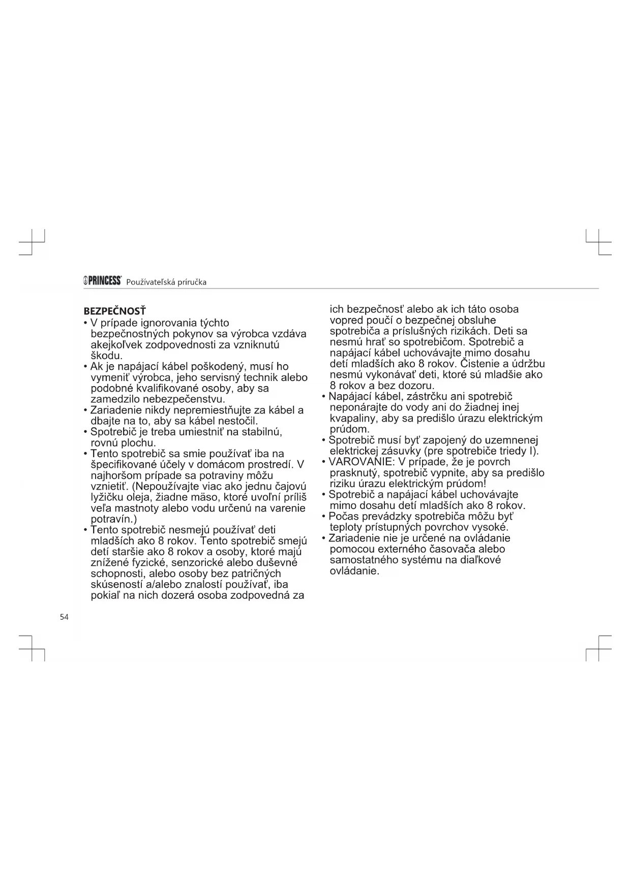 - Tento spotrebič nesmejú používať deti mladších ako 8 rokov. Tento spotrebič smejú detí staršie ako 8 rokov a osoby, ktoré majú znížené fyzické, senzorické alebo duševné schopnosti, alebo osoby bez patričných skúseností a/alebo znalostí používať, iba pokiaľ na nich dozerá osoba zodpovedná za ich bezpečnosť alebo ak ich táto osoba vopred poučí o bezpečnej obsluhe spotrebiča a príslušných rizikách. Deti sa nesmú hrať so spotrebičom. Spotrebič a napájací kábel uchovávajte mimo dosahu detí mladších ako 8 rokov. Čistenie a údržbu nesmú vykonávať deti, ktoré sú mladšie ako 8 rokov abez dozoru.
