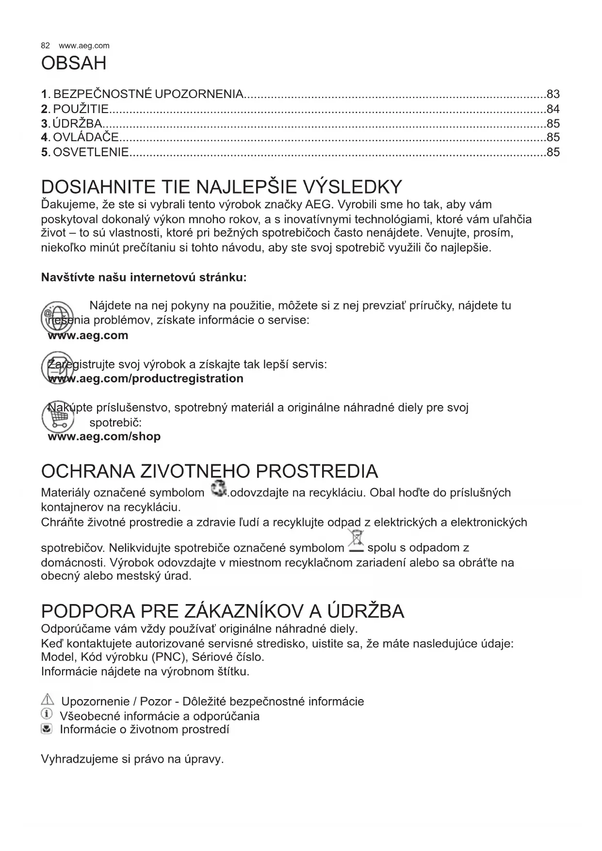 Ęakujeme, že ste si vybrali tento výrobok značky AEG. Vyrobili sme ho tak, aby vám poskytoval dokonalý výkon mnoho rokov, a s inovatívnymi technológiami, ktoré vám uľahčia život – to sú vlastnosti, ktoré pri bežných spotrebičoch často nenájdete. Venujte, prosím, niekoľko minút prečítaniu si tohto návodu, aby ste svoj spotrebič využili čo najlepšie. Navštívte našu internetovú stránku: Nájdete na nej pokyny na použitie, môžete si z nej prevziať príručky, nájdete tu riešenia problémov, získate informácie o servise: www.aeg.com Zaregistrujte svoj výrobok a získajte tak lepší servis: www.aeg.com/productregistration Nakúpte príslušenstvo, spotrebný materiál a originálne náhradné diely pre svoj spotrebič: www.aeg.com/shop