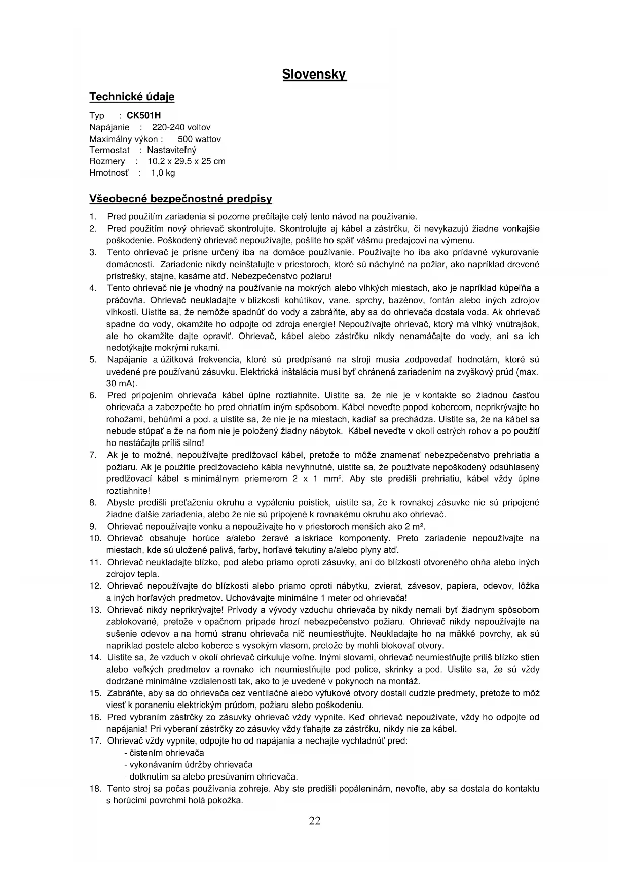 1 2 3 4 EU606 CK 500Zariadenie CK501H je elektrický konvektorový ohrievač s termostatom a ochranou proti prehriatiu. Ked zariadenie zapnete, rozsvieti sa kontrolka. Rozmrazovač CK501H je určený na uchovanie malých domácich alebo podobných mieste bez zamrznutia. Ohrievač môžete používať iba ak je namontovaný na stene (nikdy ho nepoužívajte ked stojí alebo leží!) a iba na účely, na ktoré bol navrhnutý.