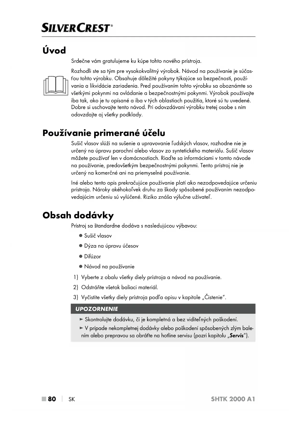 SK SHTK 2000 A1 Úvod Srdečne vám gratulujeme ku kúpe tohto nového prístroja. Rozhodli ste sa tým pre vysokokvalitný výrobok. Návod na používanie je súčas- ťou tohto výrobku. Obsahuje dôležité pokyny týkajúce sa bezpečnosti, použí- vania a likvidácie zariadenia. Pred používaním tohto výrobku sa oboznámte so všetkými pokynmi na ovládanie a bezpečnostnými pokynmi. Výrobok používajte iba tak, ako je tu opísané a iba v tých oblastiach použitia, ktoré sú tu uvedené. Dobre si uschovajte tento návod. Pri odovzdávaní výrobku tretej osobe s ním odovzdajte aj všetky podklady. Používanie primerané účelu Sušič vlasov slúži na sušenie aupravovanie ľudských vlasov, rozhodne nie je určený na úpravu parochní alebo vlasov zo syntetického materiálu. Sušič vlasov môžete používať len vdomácnostiach. Riaďte sa informáciami vtomto návode na používanie, predovšetkým bezpečnostnými pokynmi. Tento prístroj nie je určený na komerčné ani na priemyselné používanie. Iné alebo tento opis prekračujúce používanie platí ako nezodpovedajúce určeniu prístroja. Nároky akéhokoľvek druhu za škody spôsobené používaním nezodpo- vedajúcim určeniu sú vylúčené. Riziko znáša výlučne užívateľ. Obsah dodávky Prístroj sa štandardne dodáva snasledujúcou výbavou: ▯ Sušič vlasov ▯ Dýza na úpravu účesov ▯ Difúzor ▯ Návod na používanie
