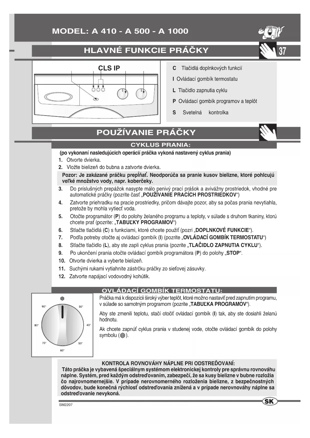 Stlačením tohto tlačidla sa zapne krátky cyklus prania pri maximálnej teplote 40°C, ktorý trvá približne 10 minút. Túto funkciu môžete použiť výhradne s programami „BAVLNA“, „SYNTETIKA“ a „DAILY“Pozn. Pri použití tejto funkcie treba prací prášok nasypať aj do príslušnej priehradky na predpranie.PREDPRANIE:Funkciou polohy stop je zrušiť nastavenia práčky. Ak z akéhokoľvek dôvodu chcete počas cyklu prania zmeniť program, alebo ak chcete po zapnutí práčky pridať ďalšiu bielizeň do bubna, stačí jednoducho otočiť programátor do polohy „STOP“ a potom otočiť ovládací gombík do polohy nového programu a stlačiť tlačidlo „ŠTART“.Pozor!! Túto funkciu vám odporúčame používať iba v naozaj nevyhnutnom prípade a iba vtedy, keď program, ktorý chcete zrušiť, nezačal skôr ako pred 3 minútami. Po zrušení nastavenia, predtým ako bude možné otvoriť dvierka, treba počkať 2 aminúty, aby sa odblokovali.Stlačením tohto tlačidla práčka zapne cyklus prania.VYLÚČENIE ODSTREĎOVANIA:Stlačením tejto funkcie práčka vykoná cyklus prania s vylúčením odstreďovania.POZN. Použite doplnkových funkcií sa viaže na druh zvoleného programu, preto, ak funkcia nie je pre určený program povolená, tlačidlo nebude funkčné (pozrite TABUĽKA PROGRAMOV). TLAČIDLO ZAPNUTIA CYKLU:39 SM2207