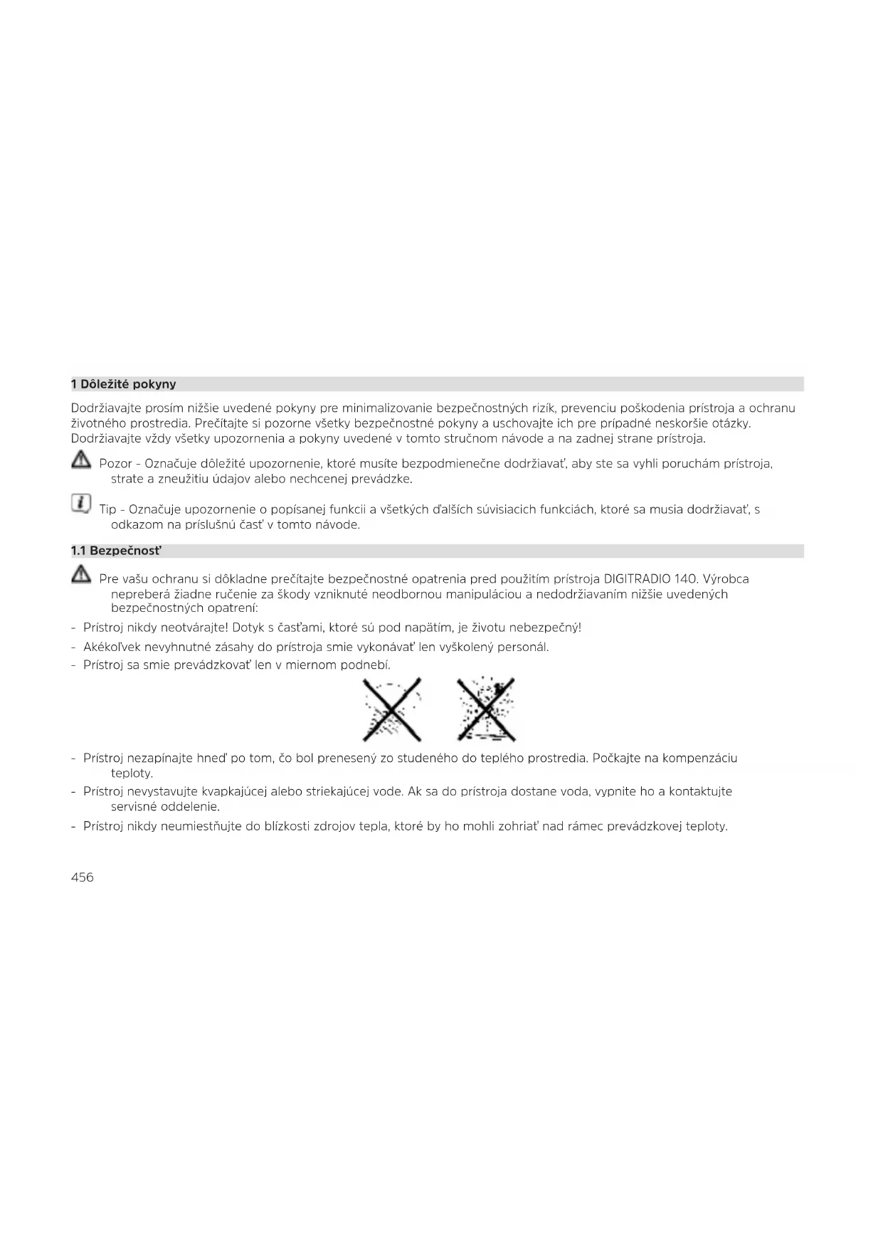 Pre vašu ochranu si dôkladne prečítajte bezpečnostné opatrenia pred použitím prístroja DIGITRADIO 140. Výrobca nepreberá žiadne ručenie za škody vzniknuté neodbornou manipuláciou a nedodržiavaním nižšie uvedených bezpečnostných opatrení: - Prístroj nikdy neotvárajte! Dotyk s časťami, ktoré sú pod napätím, je životu nebezpečný! - Akékoľvek nevyhnutné zásahy do prístroja smie vykonávať len vyškolený personál. - Prístroj sa smie prevádzkovať len v miernom podnebí. - Prístroj nezapínajte hneďpo tom, čo bol prenesený zo studeného do teplého prostredia.Počkajte na kompenzáciu teploty. - Prístroj nevystavujte kvapkajúcej alebo striekajúcej vode. Ak sa do prístroja dostane voda, vypnite ho a kontaktujte servisné oddelenie. - Prístroj nikdy neumiestňujte do blízkosti zdrojov tepla, ktoré by ho mohli zohriať nad rámec prevádzkovej teploty.457