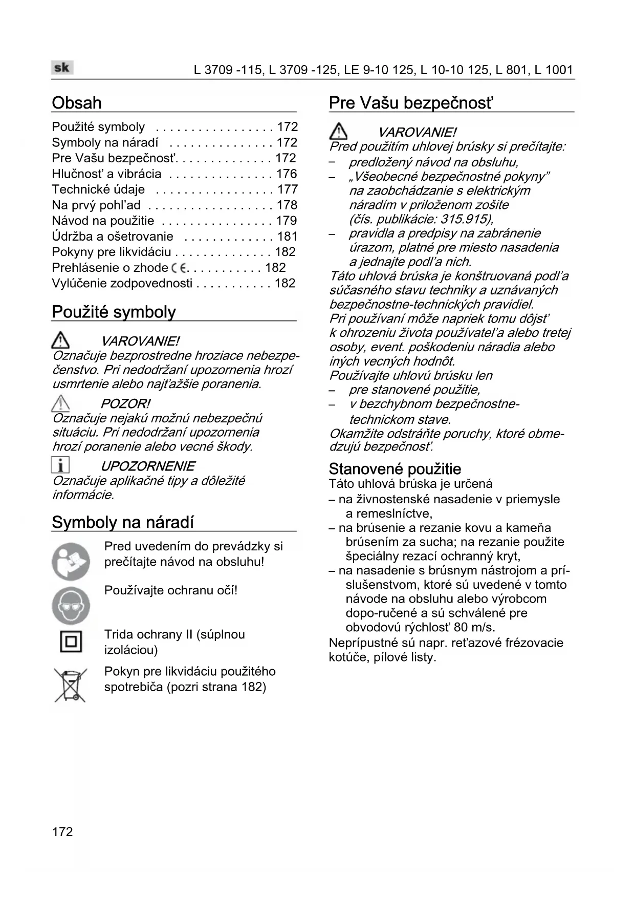 v bezchybnom bezpečnostne- technickom stave. Okamžite odstráňte poruchy, ktoré obme- dzujú bezpečnosť. Stanovené použitie Táto uhlová brúska je určená – na živnostenské nasadenie v priemysle a remeslníctve, – na brúsenie a rezanie kovu a kameňa brúsením za sucha; na rezanie použite špeciálny rezací ochranný kryt, – na nasadenie s brúsnym nástrojom a prí- slušenstvom, ktoré sú uvedené v tomto návode na obsluhu alebo výrobcom dopo-ručené a sú schválené pre obvodovú rýchlosť 80 m/s. Neprípustné sú napr. reťazové frézovacie kotúče, pílové listy.L 3709 -115, L 3709 -125, LE 9-10 125, L 10-10 125, L 801, L 1001