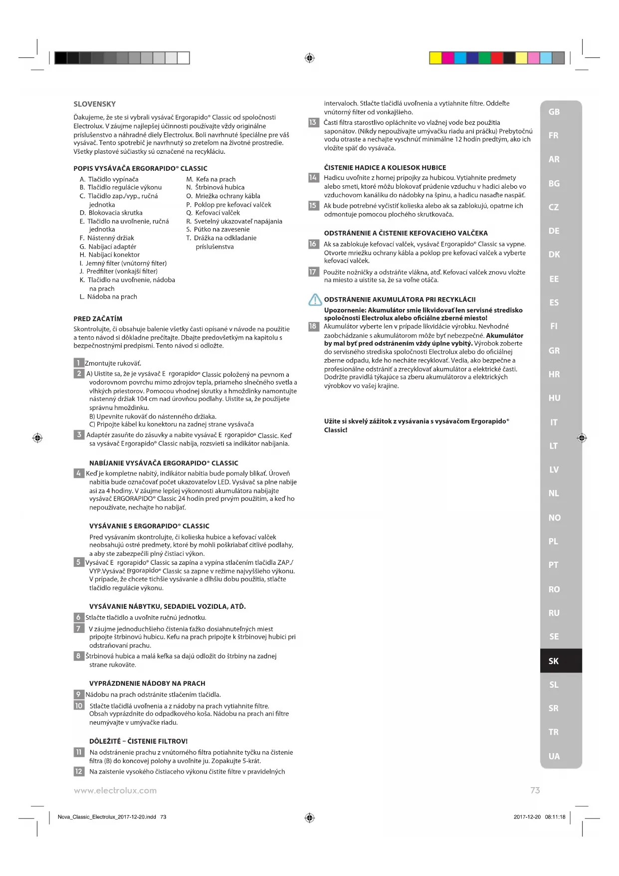Nova_Classic_Electrolux_2017-12-20.indd 72 2017-12-20 08:11:18SLOVENSKY Ďakujeme, že ste si vybrali vysávač Ergorapido® Classic od spoločnosti Electrolux. V záujme najlepšej účinnosti používajte vždy originálne príslušenstvo a náhradné diely Electrolux. Boli navrhnuté špeciálne pre váš vysávač. Tento spotrebič je navrhnutý so zreteľom na životné prostredie. Všetky plastové súčiastky sú označené na recykláciu.