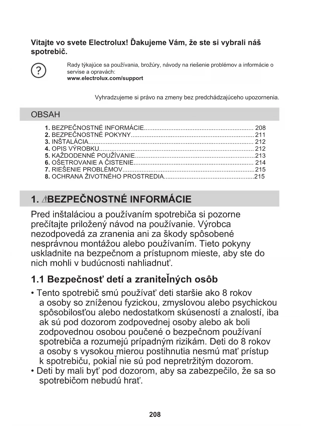 - Tento spotrebič smú používať deti staršie ako 8 rokov a osoby so zníženou fyzickou, zmyslovou alebo psychickou spôsobilosťou alebo nedostatkom skúseností a znalostí, iba ak sú pod dozorom zodpovednej osoby alebo ak boli zodpovednou osobou poučené o bezpečnom používaní spotrebiča a rozumejú prípadným rizikám. Deti do 8 rokov a osoby s vysokou mierou postihnutia nesmú mať prístup k spotrebiču, pokiaľ nie sú pod nepretržitým dozorom.